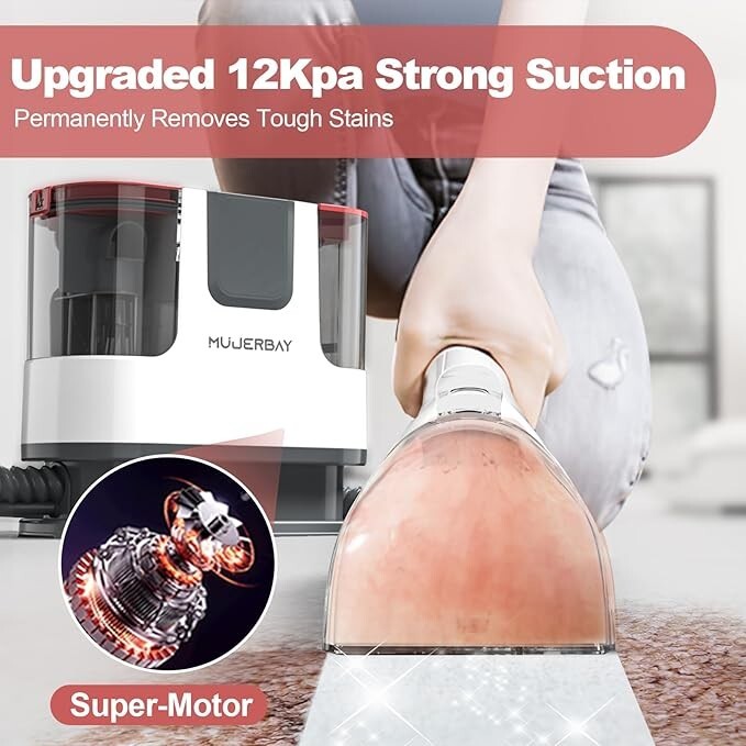 About this item Upholstery & Carpet Savior: Mujerbay upholstery cleaner machine facilitates localized cleaning of stains, conserving water resources and minimizing damage to carpeted furniture caused by repeated cleaning, thereby extending its service life. Easy Deep-Cleaning with Powerful Suction: Revolutionize your cleaning routine with our spot cleaner machine! Featuring high-pressure spraying and 12Kpa strong suction, it effortlessly deep cleans upholstery up to 1.18-inch, swiftly tackling messes like mud, wine, or pet messes throughout your home. No disassembly required for heavy sofas, car seats, or carpets anymore! Upgraded Features All for Your Convenience: Features 360° universal wheels and handles, ensuring exceptional maneuverability and portability for home cleaning. Easily reach spots and stains with a 4ft hose and 10ft power cord. Enjoy hassle-free filling, emptying, and rinsing with separate 57.5oz clean water and 20.5oz sewage tanks. Plus, its easy top-filling design helps prevent leaks and mess. Brush+Hose Self-Cleaning & Other Brushes: One-touch self-cleaning, no odor when reused, avoiding secondary pollution. Besides, you've got the tools for every mess, the water sucker with brush combines brush and suction for deep cleaning, and the extra right-angled water sucker can clean cracks and hard-to-reach areas. Pro Service: Mujerbay offers 30 days money-back guarantee and technical consultation. If any problems, please feel free to contact us via amazon, problems will be solved within 2 working days. Items are new, open box and/or returns. We do the best we can to describe accurately. Items are sold as is and all sales are final. We do not accept returns. We have these item's listed locally and reserve the right to remove the listing at any time if items sells before listing finishes.