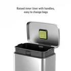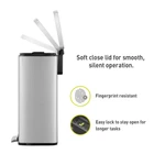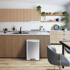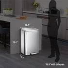 The Madison rectangular step trash can is constructed of fingerprint-resistant brushed stainless steel for a sleek appearance that complements your living spaces without drawing attention to your trash can. The rugged step pedal mechanism is built to withstand years of daily use, and the bi-force damper soft open and close lid prevents slamming and banging. Stay open locking lid allows you to hold the lid open longer when necessary. Use your favorite deodorizer in the built-in compartment on the underside of the lid to keep your kitchen smelling fresh between bag changes. The removable polypropylene inner liner has a cut out bag fixer slot to tuck in your trash bag so it won't slip down into the can. Generous 50L (13.2 Gallon) capacity takes standard kitchen trash bags so no special orders required. Look for extra-strong 13G trash bags EK33706B for leak-proof protection that is 10% thicker than competitor's bags. US based customer support team. Dimensions: 16.9"W x 14.3"D x 25.4"H. Height with lid open: 36.6" Superior Stainless Steel Build- This heavy-duty stainless steel garbage can boasts an ultimate fingerprint-resistant stainless steel construction that provides a versatile and stylish waste disposal solution perfect for the home, office or other spaces. Whisper-quiet Closing - The rugged step pedal mechanism is built to withstand years of daily use, and the bi-force damper soft open and close lid prevents slamming and banging. Stay Open and Do Your Thing - This kitchen garbage can boasts an easy-to-use lid lock, ensuring it stays open as long as needed. Quality Construction Built to Endure - Our durable stainless steel foot pedal is built to last over 200,000 times, ensuring smooth and reliable operation for years to come! Elevated Inner Bucket with Handles: The Madison stainless trash can features a raised inner bucket with convenient handles, ensuring swift and hassle-free bag replacement.