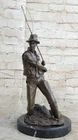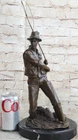 Condition : This sculpture is in perfect condition. Bronze Dimensions with Marble Base: Height 16" X Width 8" Marble Dimensions: Diameter 8" Height without base:15" Weight:10 LBS Inventory:27X24684972 Witness the struggle for survival captured in exquisite bronze artistry with this poignant sculpture. Depicting a man's determination as he fishes with a simple stick, this artwork portrays the resilience of human spirit in the face of adversity. The man's attire, complete with a protective hat and a small bag, underscores his resourcefulness and his battle against the elements while navigating the challenging river. Crafted using the age-old method of lost-wax casting, this sculpture embodies the artist's commitment to preserving the intricate details of the scene. The brown patina finish not only enhances the sculpture's aesthetic appeal but also adds a touch of timelessness to the narrative it conveys. Resting on a sturdy black marble base, this artwork stands as a testament to human fortitude and the enduring power of art to capture the essence of human experience. Signed by the artist Thomas, this bronze sculpture invites viewers to contemplate the struggles and triumphs that define our existence. Whether displayed in a collection or as a standalone piece, it serves as a reminder of the resilience within us all and the stories that art can uniquely convey. Signed Original English Thomas Fisherman Fish Bronze Sculpture Statue Figurine www.bronzhaus.com Video will open in a new window Using the eBay App? Paste link into a browser window: [isdntekvideo]