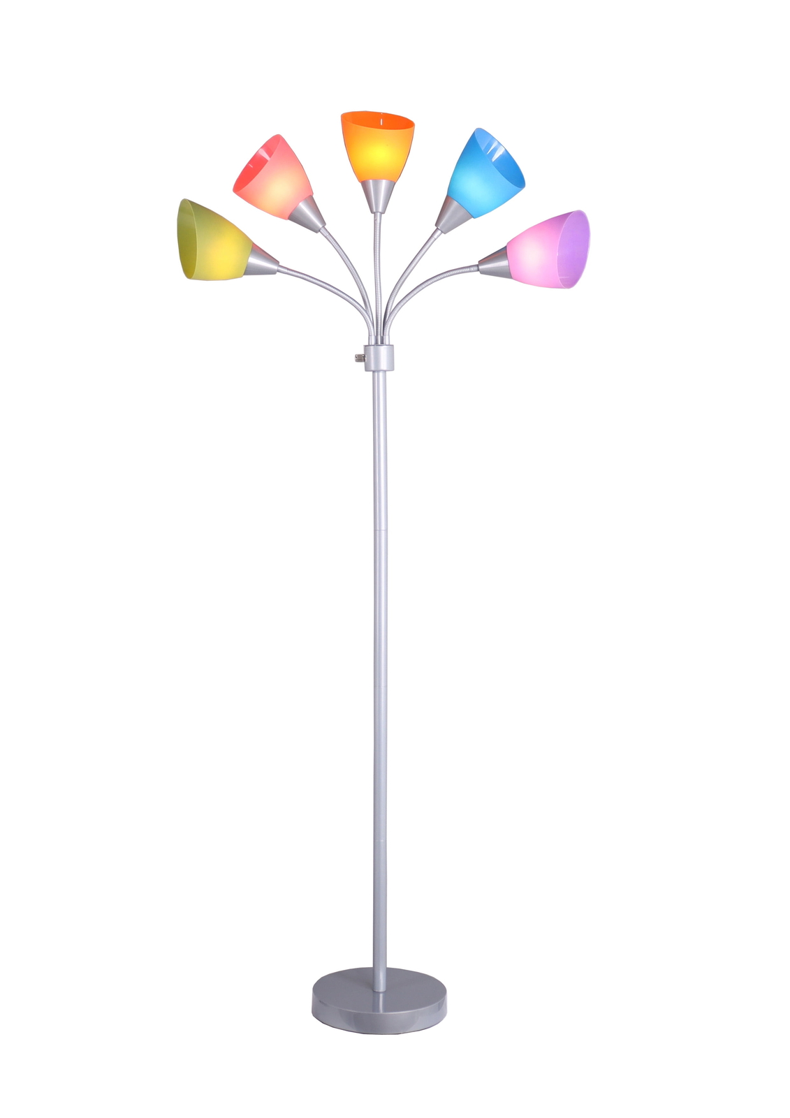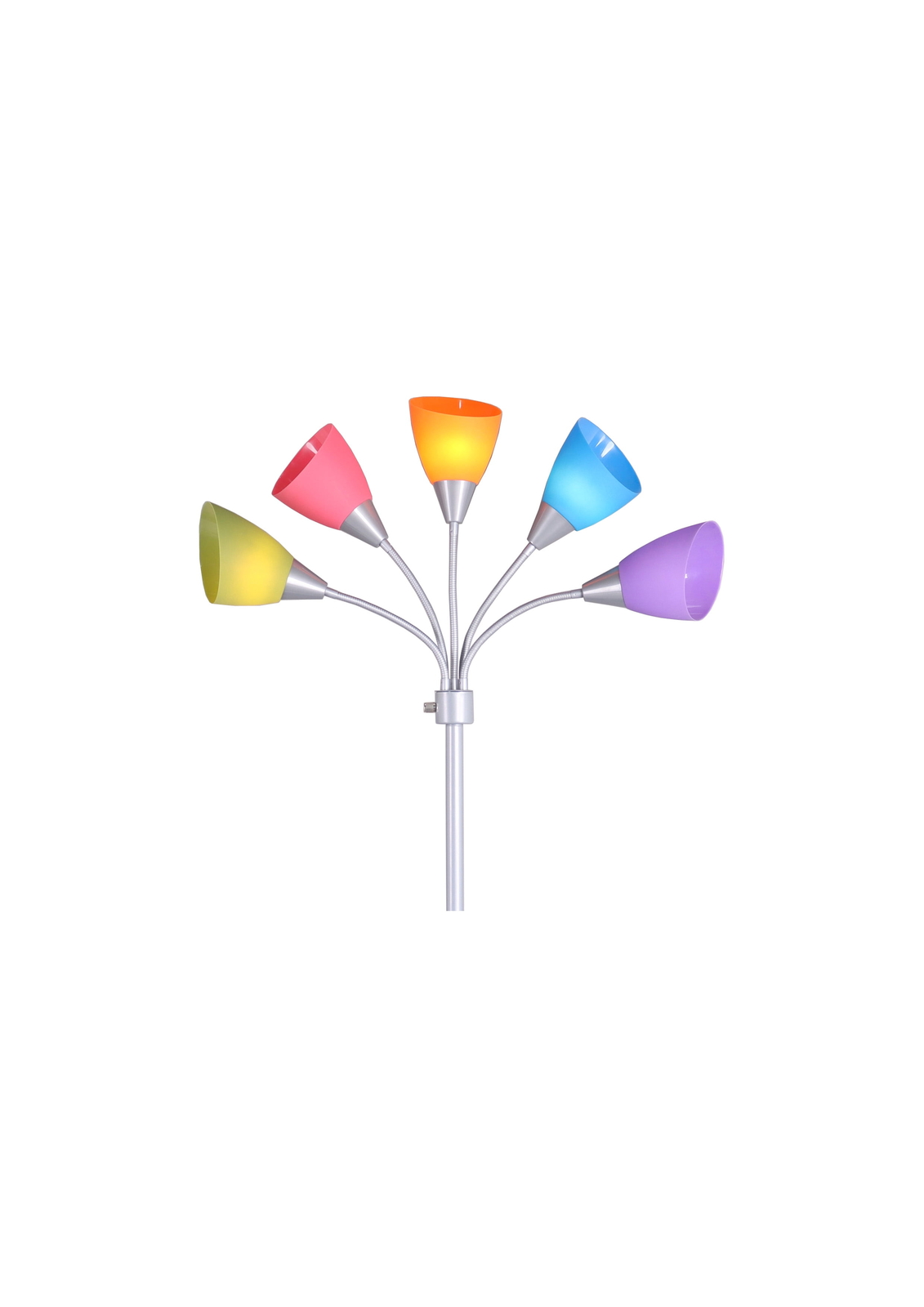 The Mainstays 5-Head Silver Floor Lamp, model JK 1671-FL-SLV with multi-color pastel shades, is perfect to use in kids bedroom, playroom, living room or office to add fun. Standing at a height of 67 inches, this freestanding floor lamp has a slender tubular body atop a round base. It has five cone shades attached to the top with flexible gooseneck arms to focus light where you need it, and a variable multi-head setting to allow versatile lighting options to illuminate all the lights or just a few at a time. It requires 5x60W or 9W LED bulbs (sold separately). Add this fun and vibrant 5-head floor lamp to your home for a unique look next to a sofa or arm-chair to add versatile adjustable lighting to your living room, den, dorm, office, kids bedroom or playroom. This lamp is easy to maintain and easy to assemble. Adult use. Overall height 67" Model: JK1671-FL-SLV Classic Modern Styling Silver with multi-color shades Teen or adult use Easy 4-way turn knob switch Sturdy metal base 5 shades - multi color