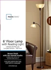 The Mainstays JK1660BRN combination floor lamp is two lamps in one, featuring a 100-watt main lamp with an additional 60-watt reading lamp (light bulbs not included). This sturdy yet slim 72" brown lamp includes an attached reading lamp with an adjustable gooseneck, two tea-stained color shades for a subtle ambient effect, and a 9" diameter base. The main top light is controlled by a 3-way rotary switch and a simple on/off switch for the bonus reading lamp. The sleek and modern design makes this lamp a perfect addition to any adult living room, bedroom, or home office and a must-have for college living spaces. 72" JK1660BRN floor lamp3-way rotary light for main light source Ideal for bedrooms, adult home offices, dens, dorm rooms Available color: black, silver, brown, white Modern styling complements the decor of most living areas Reading light features a flexible arm shades absorb light intensity as it is needed 100W and 60W bulbs required (not included) Additional reading light has a convenient on/off switch