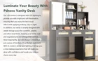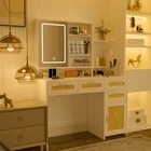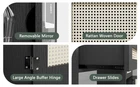 Specification Product Information Product Name: Makeup Vanity with Lights in 3 Colors & Openable Mirror, Vanity Desk with 4 Drawers & 1 Cabinets & Shelves, Vanity Table Rattan Vanity Dresser, for Bedroom Main Material: MDF Number of Drawers: 3 Drawers Product Door Type: Sliding Type of Storage Included: Drawer Drawer Features: Extra Deep Drawers Use Case: Bedroom Product Dimensions Assembled Length (in.): 42.90 Assembled Width (in.): 15.75 Assembled Height (in.): 57.00 Weight (lbs.): 83.50 Product Features The premium LED lights of the makeup table can switch 3 colors to meet your different needs. Natural light is suitable for daily skin care and make-up, cold light is suitable for professional cold color makeup, and warm light is suitable for evening makeup and dating makeup, and The brightness of the light can be adjusted according to your needs. Let ours vanity set give you a perfect make-up look! Vanity with Storage: The make up vanity has storage shelves, 4 drawers, and 1 cabinet. The storage space on the back of the mirror allows for personal belongings,and right cabinet has a perfect height and can be placed next to the bed as a nightstand, saving money and space. Give you more options for storing things. The open storage rack on the right side is large enough to keep your commonly used cosmetics within reach, the spacious desktop and 4 drawers of different depthscan classify and store your jewelry, hair accessories, and cosmetics. Use the dressing table to keep your makeup area free from clutter! Our makeup vanity comes with clear instructions that shows illustrations and marked all the parts. Follow the steps and persist, and the final result will never disappoint you! Overall size: 42.83”L x 15.7”D x 57.09”H.( Note : The Vanity desk doesn't include the bench)