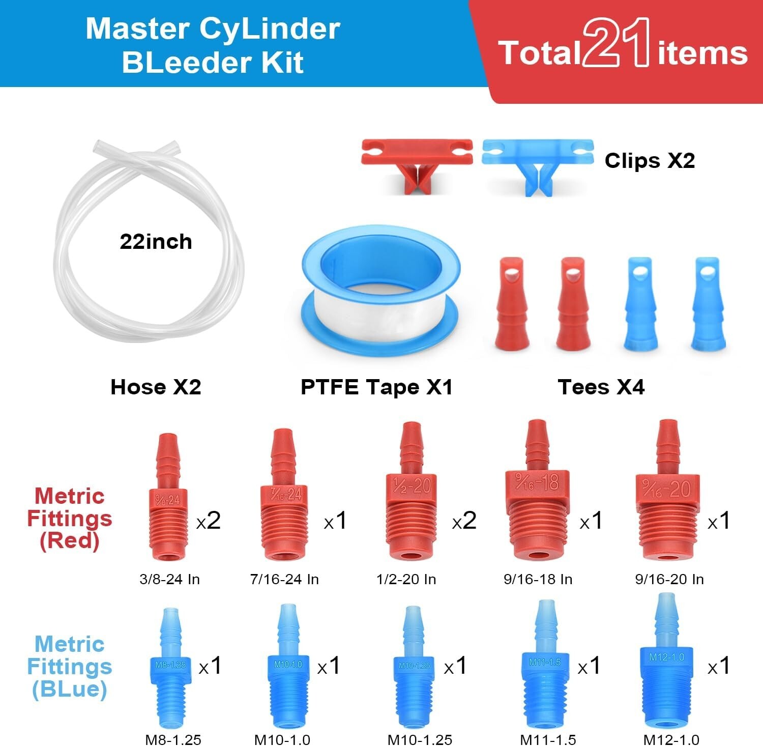 The transparent silicone hoses in this brake bleeder kit allow for easy confirmation of fluid presence, ensuring a hassle-free bleeding process. You can work with confidence, knowing that you’ll see exactly what you need. This master cylinder bleeder kit is a comprehensive solution, designed as a replacement for model 14151. It includes 2 transparent soft hoses, 10 pairs of red threaded fittings, 10 pairs of blue threaded fittings, 2 T-joints, a pair of clamps, and a roll of PTFE tape. Our brake master cylinder bleeder kit features both SAE and metric fittings, making it suitable for nearly all common master cylinder thread sizes. This versatility ensures compatibility with a wide range of vehicles, delivering convenient and reliable performance. Presented in an exquisite color box, this complete brake bleeder kit makes for the perfect practical gift for automotive enthusiasts and mechanics, combining utility with thoughtful presentation. Metric dimensions: M8-1.25, M10-1.25, M10-1.0, M11-1.5, M12-1.0 Imperial size: 3/8-24In, 7/16-24In, 1/2-20 In, 9/16-18 In, 9/16-20 In