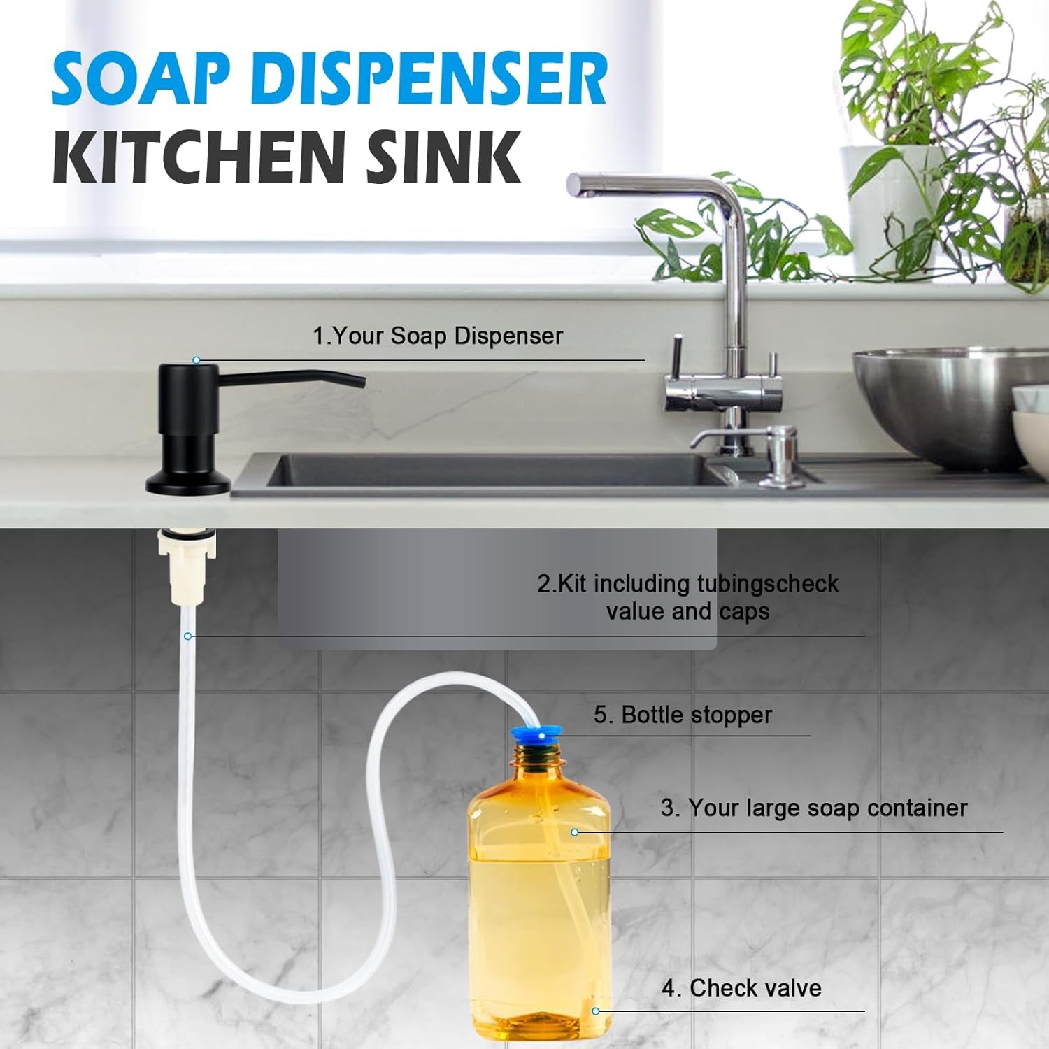 Dish Soap Dispenser for Kitchen Sink, Countertop Sink Matte Black Product Details Color: Matte Black Material: Stainless Steel, Acrylonitrile Butadiene Styrene (ABS) Brand: Alwanta Product Dimensions: 1"L x 1"W x 1"H Shape: Round Number of Sets: 1 Number of Items: 1 Item Weight: 7.8 ounces Manufacturer: Alwanta Country of Origin: China Item model number: 2-05 【NO MORE MESSY REFILLS】:No more crawling under the sink. Our elegant sink soap dispenser comes with a tube that goes directly into a large dish soap bottle, you can skip the frequent refill process 【Sink Soap Dispenser】: the soap dispenser is made with stainless steel and ABS plastic, it is acid-resistant and corrosion-resistant, the pump can rotate 360 degrees, suit your different need, built-in spring, the press head is smooth rebound 【Multipurpose Use】: It can be used as follow: hand soap, liquid dish soap, shampoo, shower gel, ideal for kitchen, hotel or commercial uses.and check valve make it easier to pump out the soap, keep soap primed at the top of the tube 【Easy to Install and Use】: Our soap dispenser you can install it on any type of kitchen sink or countertop within a couple of minutes. (like granite, stainless steel, wood ). With the long hose, skipping the messy process of refilling the soap dispenser 【Ensure】: 30 days money back,12 months quality ensure. Any reason that makes you dissatisfied with this soap dispenser, let us know and we will make it right. Add this great sink soap dispenser, saying goodbye to frequent refills