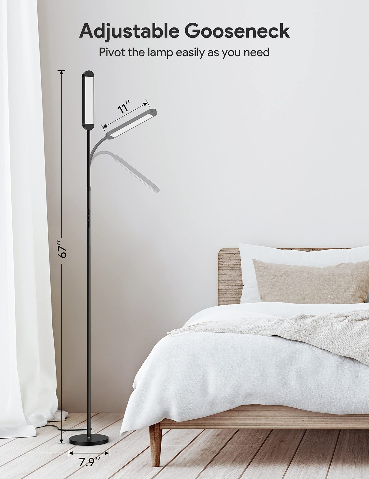 Remote Dimmable LED Gooseneck Floor Lamp 5 brightness levels and 5 different color temperatures: the floor lamp has 5 brightness levels of 20%-100% and 5 varying color temperature of 2700k-5700k, which can be adjusted by stepless dimming or click to adjust 1.Remote control and touch control: The configuration of remote control and touch control provides consumers with more control options and a better lighting experience 2.Remote or touch Control as you like: Different options between remote control and touch control provide every customer an exceptional and wonderful lighting experience 3.Stylish and simple appearance: smooth gooseneck design, rounded stable base, black appearance, make the floor lamp simple and fashionable, suitable for most home environments, and play a role in lighting and decoration 4.Trendy and simple look: Design with smooth gooseneck, stable round lamp holder and black appearance, this floor lamp presents modern simple style, and plays a decorative and lighting role for most home enviroments Overall/General/Multiple/Practical functions: wall plug, night light mode, 1 hour timer function, memory function, closable indicator light and other functions are all available Super Easy installation: You can easily assemble this floor lamp according to the user manual within 5 minutes Notice: 1. Please do not adjust the angle of the lamp cap excessively to avoid damaging the gooseneck and lamp cap. 2. Please hold the lamp pole when you are adjusting the angle. 3. If the remote control does not automatically match up with the lamp, you can do/match it manually. First of all, unplug the floor lamp and then plug it back in. Afterwards press the top 2 buttons, the switch and the night light button, on the remote control at the same time within 30 seconds; When the floor lamp flashes alternately once, the match is success/the connnection is done. ๐ ๐๐ซ๐ข๐ ๐ก๐ญ๐ง๐๐ฌ๐ฌ & ๐ ๐๐ฒ๐-๐ฉ๐ซ๐จ๐ญ๐๐๐ญ ๐๐จ๐ฅ๐จ๐ซ๐ฌ: floor lamp has 5 levels of brightness (20%-100%) and 5 color temperatures (2700k-5700k) to choose from, easily customize your lighting experience. Stepless dimmable and finger tap adjustment are both available. The LED floor lamp has sufficient brightness, while the light is soft and flicker-free, protecting your eyes ๐๐ง๐ญ๐๐ฅ๐ฅ๐ข๐ ๐๐ง๐ญ ๐๐๐ฆ๐จ๐ญ๐ & ๐๐จ๐ฎ๐๐ก ๐๐จ๐ง๐ญ๐ซ๐จ๐ฅ: Remote and Touch control both can turn the floor lamp on and off, adjust the brightness or color temperature as you wish. The remote control design allows you to easily control the standing lamp without leaving warm sofa or bed (within 49.2 ft/15 m). Lighting modes on the remote control can meet various lighting scenes such as reading, working, entertainment, breastfeeding, and resting ๐ ๐ฅ๐๐ฑ๐ข๐๐ฅ๐ ๐๐จ๐จ๐ฌ๐๐ง๐๐๐ค ๐๐๐ฌ๐ข๐ ๐ง: 360ยฐ adjustable gooseneck allows the LED floor lamp head to rotate up, down, or sideways and helps direct the light to any place you need it. Smooth gooseneck design living room floor lamp matches easily with any home decor style ๐๐ข๐ฆ๐ข๐ง๐ & ๐๐๐ฆ๐จ๐ซ๐ฒ & ๐๐๐ฅ๐ฅ ๐๐ฅ๐ฎ๐ ๐๐ฏ๐๐ข๐ฅ๐๐๐ฅ๐: 1-hour timer function of this modern floor lamp reminds you to take a break in time, good for your eyes. This dimmable floor lamp can also be used as a night light. When using the wall plug (rather than the remote control or touch) switch to turn off the lamp, the memory function allows you to turn on the lights with one button while keeping the last use settings ๐๐๐๐ ๐๐๐ฌ๐ข๐ ๐ง & ๐๐๐ฌ๐ฒ ๐๐ฌ๐ฌ๐๐ฆ๐๐ฅ๐ฒ: The safe and stable base minimizes the potential danger of pets and children being tipped over. The assembly is very simple, following the instructions, you can install the LED floor lamp in 5 minutes without extra tools