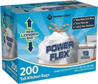 About this item Member's Mark 13 gallon Tall Kitchen Bags New Longer Bag, 200Count(Pack of 2) Capacity 13 Gallons Unit Count 400.0 Count Recommended Uses For Product Kitchen Waste Material Linear Low Density Polyethylene, High Density Polyethylene Item Form Bag Scent Fresh Number of Items 2 Item Weight 8.8 Pounds The information below is per-pack only Fresh scent beats trash odors Product Description Member's Mark Power flex tall kitchen bags will revolutionize the way you think about trash bags. Feature-rich, these bags deliver quality and Strength in all of the important areas. The patent-pending, double-thick top multiplies the strength of the top five inches of the bag, providing an extra measure of security and preventing finger punctures during bag removal. The power flex Technology enhances the bag's exceptional qualities and flexes to expand around contents. The innovative seals along the sides of the bag protect from leakage. And, the elastic drawstring expands to keep the bag tight on your trash can and is designed to make carrying to the curb worry-free. This 13-gallon bag fits most kitchen cans and is convenient for home office use. Plus the fresh clean scent neutralizes odors to keep your kitchen smelling fresh always!