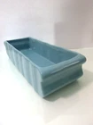 12" long planter box. About 2.5" deep- measured from the inside of the box. Width of the box is 4" wide. May fit on wider window sills. Weight is just over 2 pounds. Mid Century Modern style with ribbed details on the sides. Stilt marks on the underside- used when glazing.