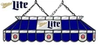 You are bidding on a Miller Lite Beer Billiards Stained Glass Mirror Pool Table Light Lamp 40 inches. The fixture is brand new in the box. This truly sets this lamp far ahead of any other pool light available in the industry. It is very unique. All of our lamps are hand made in the USA. The finest materials are used in the manufacturing of our stained glass lamps. this Pool Table Billiard Game Table Lamp is a must have! STUNNING HAND CRAFTED 40" old world tiffany style stained glass pool table billiard lite. Fully wired in line for direct wire with 3 UL approved high quality porcelain light sockets and two 3.9' heavy duty antique brass chain on each side of the lamp for hanging. (only one cord goes up to the canopy for wiring). Ceiling mount canopy kit included. Handmade in the USA. Light bulbs not included. Lamp measures 40 1/2" long by 16" wide x 11 1/2 high. Logos are silk screen printed on mirror glass to give it a classic bar look 108 individual hand cut pieces of glass 40 1/2" long x 16" wide x 14" high 3 quality high porcelain light sockets recommended bulb wattage: 60W ( BULBS NOT INCLUDED) 10 ft. electric cord for wiring direct wire 3.9' of heavy duty antique brass chain on each side for hanging textured blue stained glass and mirror glass for that old world classic bar look ceiling mount canopy kit included Handmade in the USA The chain attaches to the lamp in three points, those three points form two triangles that come to two points, the two triangles come up of the lamp about 11". Off the two triangles we put 3' of chain. that's almost 4' from the end of the chain to lamp. now we don't advertise that there is 9' of chain, but there is 9' of chain total on the lamp. THIS LAMP IS GREAT FOR Sports Bar and grills Restaurants Taverns Liquor stores Billiard Halls Game rooms Billiard table lighting Poker Table lighting Overhead bar lighting Man Caves/li> Dorm Rooms Dining Tables High Bidder to pay $124.95 shipping, packing, and insurance charges due to the large size of this custom made box for shipping. Please allow approx 4 weeks for delivery as these are hand made. UPS will not deliver to a P.O. Box or Military Addresses. You will need to provide a physical address otherwise we cannot ship your item. Shipping to Hawaii, Alaska, and Puerto Rico will require additional shipping charges due to size of box. Please contact us for rates. Click Here to check out our other pool lights & bar stools for auction on eBay