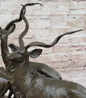 Milo`s Handmade Wildlife Bronze Figurine - Kudu Antelope Family Classic Art Sale Milo`s Handmade Wildlife Bronze Figurine - Kudu Antelope Family Classic Art Sale Condition : This sculpture is in perfect condition. Bronze Dimensions with Marble Base: Height 15.5" X Width 17" Marble Dimensions:17" X 7.5" Height without base:14.5" Weight:29 LBS Step into the untamed beauty of the African savannah with the "Kudu Antelope Family" bronze sculpture, a captivating masterpiece by the skilled artist Milo. Crafted with meticulous detail using the time-honored lost wax method, Milo's expertise breathes life into bronze, creating an evocative portrayal of a gazelle family. The graceful curves and intricate features of the Kudu Antelope showcase Milo's commitment to capturing the essence of these majestic African deer. Resting proudly on a sleek black marble base, this sculpture is more than a mere representation; it is a harmonious fusion of art and nature. Milo's signature adorns this original artwork, certifying its authenticity and marking it as a unique collector's piece. The brown patina applied to the bronze enhances the natural beauty of the Kudu Antelope, adding depth and warmth to every curve and contour. As an exquisite home or office decoration, the "Kudu Antelope Family" bronze sculpture by Milo invites you to connect with the spirit of the African plains. Whether displayed as a standalone piece or part of a curated collection, Milo's creation serves as a testament to the enduring allure of wildlife art and the craftsmanship that brings nature's beauty into the heart of your space. Kudu Antelope Family Gazelle African Deer Bronze Sculpture Figurine Statue www.bronzhaus.com Video will open in a new window Using the eBay App? Paste link into a browser window: [isdntekvideo] Shipping Terms : Most of our items are shipped via USPS (United States Postal Service) mail or UPS. Most orders are shipped within 24-48 hours of purchase. Please be aware that not all items are available for USPS shipping due to size and weight. We do ship to Hawaii, Alaska, Canada, Puerto Rico, APO/AE, and U.S. Virgin Islands, however, an additional charge may be required. Please contact us before making any purchases in these areas. For Non-USA customers, you may be responsible for all duty, tax, brokerage fees that may be due upon delivery (shipping costs cover freight charges only). We also ship internationally. Please refer to the "Shipping and Handling" chart for the rates for each area. Payment : We accept just about any form of payment. PayPal, Master Card, Visa or American Express credit cards. Money orders, cashiers checks, and even personal or business checks. For governmental institutions, we will also accept a purchase order. Please understand that for personal or business checks we have to wait for the check to clear (usually 7 days) before shipping. Condition : New Detailed Hand Crafted Hot Cast Bronze Satisfaction Guaranteed. This is Stock Photo, Slight Color Variation!! Listing and template services provided by inkFrog