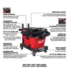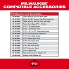 Features Part of the Most Versatile Wet/Dry Vacuum System POWERSTATE Brushless Motor and optimized components Outperforms 3.5 Peak HP Wet/Dry Vacuums, delivering more cleaning power than corded Reinforced casters and tread design deliver up to 8X wheel life Crush and twist resistant hose construction deliver up to 2X hose life Interchange motor heads, tanks, and carts for varying performance, holding capacity, and mobility with the easy access foot pedal MAX POWER MODE delivers up to 31 minutes of continuous cleaning time, and up to 1,000 ft2 of debris clean up per charge on a M18 REDLITHIUM HIGH OUTPUT HD12.0 Battery Pack MAX RUN-TIME MODE delivers up to 47 minutes of continuous cleaning time and up to 1,300 ft2 of debris clean up per charge on an HD12.0 Battery Pack Quickly swap or clean filters with the easy access quarter turn design Included Large High Efficiency Filter ensures optimal dust and microparticle collection Can be used with a MILWAUKEE Fleece Dust Bag for less debris build up on the filter Integrated accessory storage on the motor head, allows for easy access to the crevice tool and utility nozzle (4) latching points on the motor head to store and secure the Vacuum Tool Storage Bag (49-90-2019) Replacement Large Wet/Dry Vacuum High Efficiency Filter Model Number: 49-90-1978 1-7/8" Hose Diameter 87 CFM & 60" of Suction What's in The Box M18 FUEL Wet/Dry Vacuum Motor Head(0911-20) 6 Gallon Wet/Dry Vacuum Tank(0922-20) Wet/Dry Vacuum Cart(0923-20) Large Wet/Dry Vacuum High Efficiency Filter(49-90-1978) 1-7/8" x 9' Flexible Hose(49-90-1996) 1-7/8" Crevice Tool(49-90-1988) 1-7/8" Floor Utility Nozzle(49-90-2011) (2) 1-7/8" Extension Wand(49-90-1987) Battery Sold Separately M18 FUEL 6 Gallon Wet/Dry Vacuum (0910-20) AIR-TIP 4-1 Right Angle (49-90-2026) Bag Only (49-90-2019) Owner's Manual Warranty 3 Years Limited Factory Warranty 30 Day Satisfaction Guaranteed Specifications SKU 0910-20RAB Brand Milwaukee Volts 18V Power Cordless CFM 87 Length 31 in. Width 19 in. Height 24.2 in. Weight 26 lbs. why buy from us? secure & hassle-free shopping All items are covered by manufacturer warranty. fast shipping Most orders delivered in 1-3 business days. customer service Call us toll free: 1-800-629-3325 satisfaction guaranteed All our sales are backed by a 30-day satisfaction guarantee.