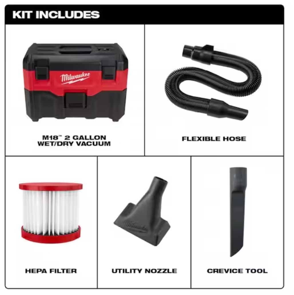 Product Description : The Milwaukee M18 Cordless 2 Gal. Wet/Dry Vacuum provides users with a Powerful and Portable Wet/Dry Clean-up tool. A high-performance motor creates powerful suction for both wet and dry applications. The Milwaukee M18 Cordless 2 Gal. Wet/Dry Vacuum has a stackable design and organized on-board storage that keeps all of the attachments inside the unit for convenient transport and storage. The 0880-20 Milwaukee M18 Cordless 2 Gal. Wet/Dry Vacuum comes with a flexible hose, crevice tool, utility nozzle and a certified HEPA filter. With 30 plus minutes of run time on a M18 REDLITHIUM HIGH DEMAND 9.0 Battery Pack, it's ideal for extended spot and area clean up. Features: 45 CFM 32 in. of water lift Attachments included: 6 ft. flexible hose, crevice tool, utility nozzle and HEPA filter Stackable tool box design Built-in blower port HEPA filter included Hose diameter: 1-1/4 in. 2 Gal. capacity Includes: (1) M18 0880-20 2 Gallon Vacuum (1) 6 foot Flexible Hose, , , (1) Crevice Tool (1) Utility Nozzle (1) HEPA filter (1) Instruction Manual Condition: Brand New in the Box This part is guaranteed to be a GENUIN