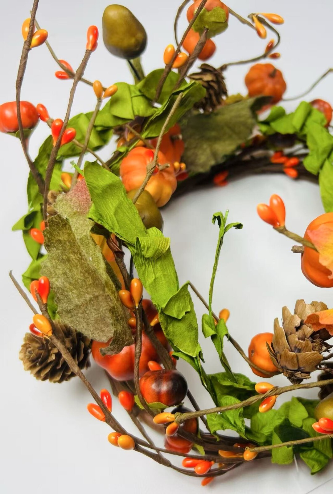 Add a festive touch to your fall decor with this beautiful artificial candle ring featuring lifelike mini pumpkins, berries, pinecones, and colorful fall leaves. Perfectly sized to fit 6.5” candles, it makes a charming centerpiece or accent for mantles, dining tables, and shelves. Crafted with flexible brown-wrapped wire for easy shaping. A great addition to your rustic farmhouse Thanksgiving setup.