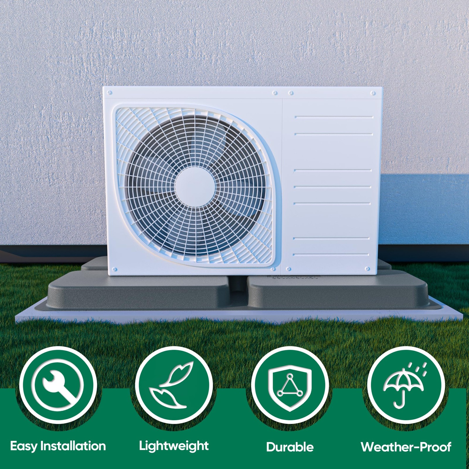 The mini split condenser pad provides a leveled surface above ground, reducing moisture exposure and preventing cracks. Its cross-hatch design evenly distributes weight, avoiding sagging or deformation. Recessed grooves allow for expansion bolt installation, ensuring stable placement. Measuring 34.6 x 18.1 x 2 inches, it fits most mini split units (7000-100,000 BTU). Made from eco-friendly PP material, it resists pressure, corrosion, and aging, lasting up to 8-10 years. Drillable for secure installation on flat surfaces, it supports up to 740 lbs Strong Equipment Pad: The mini split pad provides a leveled surface above ground, reducing moisture exposure. This air conditioner pads for outside has a unique styling design construction that prevents cracks and offers superior load-bearing capacity Special Design: The mini split condenser pad features a cross-hatch pattern on the surface to distribute weight evenly, preventing sagging or deformation. Recessed grooves of the pad allow for the installation of expansion bolts, ensuring stable placement Universal Size: Measuring 34.6 x 18.1 x 2 inches, this equipment pad is the perfect base for mini split condensers and air conditioner heat pump systems. Ideal for supporting mini split condenser units, this condenser pad ensures stable installation Lightweight and Durability: The condenser pad is made from eco-friendly PP material, offering pressure resistance, anti-corrosion, and anti-aging properties. New materials further extend its lifespan up to 8-10 years, ensuring long-lasting performance Considerate Notice: The mini split pad is drillable for securing the mini split ac/heating system and should be placed on flat soil or a hard surface. Suitable for AC units (7000-100,000 BTU) and offers a maximum loading capacity of up to 740 lbs