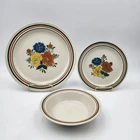 The Mioko Newcor Designer Collection 151 is a vintage set of dinner and salad plates and bowls. Made in Japan in the 1970s; these stoneware items are durable and in excellent condition. These pieces are microwave, oven, and dishwasher safe. The plates feature a hand painted mid-century design of colorful flowers. There are 3 selections for purchase: 6 dinner plates measuring 10.5" 7 salad plates measuring 7" 4 bowls measuring 7"
