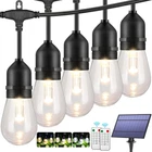 Amazing 3-color in 1 Solar String Light with Jump and Fade Modes: This light is an awesome combination that you've never met before!! Built by the latest LED technology, you can get 2700K 4000K 5000K color lights all in one string, moreover, it is dimmable, smoothly dimmed from 25%-100% by included remote controller. It fits well for many indoors and outdoors activities such family dinner, summer night barbeque, camping, weddings, celebrations. Just try and you will not regret Zero Energy Bills & Auto On/Off: Running by solar energy, so it will completely save your electricity and absolutely easy to install without any outdoor outlets needed. Please note: the light only automatically light up in the evening and off in daytime or you can set set time for working by the remote, no need to turn on & off the lights manually. More convenient to adjust solar panel with a clip (e.g. to pergola or fence) or a stake to mount it in the ground No Worries, Whatever Sunny or Rainy: A premium super large-capacity solar panel and an addition USB charging port, they allow customers use these string lights well even in the bad conditions. Giving you two cool options to choose from, a full charge takes 8 hours of sunlight and 6 hours via USB (can be used up to 8-10 hours/charge). Note: The charging time may take longer than 8 hours when it is on cloudy days All Weather-resistant & Extremely Durable Shatterproof Bulbs: These 48 ft commercial grade solar string lights are equipped with 18 LED S14 Shatterproof Plastic bulbs (3 spares) and 15 IP65 Waterproof E26 base sockets. Safer than glass bulbs and withstand well from extreme hot / cold temperatures and rainy, windy, or damp climates for years of use. Please note that multiple strings solar string light can't be connected together, as one solar panel can only offer enough power to one string light Please note that our solar panel is light-sensitive and will only light up automatically when the surrounding environment is dim. The string light will automatically turn off after 6 hours working. Package contains 15 + 3pcs LED bulbs, 1 pack 48 ft strand, 2pcs remote controllers, 1 solar panel with a stake & a clip and user manual The solar panel with a 6-hour auto shut-off timer function, protecting the battery's power reserve. Even during rainy days, it still has the ability to provide illumination for your patio Product Description Mlambert 3 in 1 Dimmable LED Outdoor Solar String Lights - Create a relaxed and romantic ambiance for your family every day of the season! Save on Bills & Dusk to Dawn Solar Powered Lights! Auto Fully Charging at Daytime for 8-10 Hours Say goodbye to expensive electricity bills and embrace the energy-saving benefits of our solar-powered light. 5000mAh Large capacity solar panel absorb solar energy 8 hours of direct sunlight can last 8-10 hours. When cloudy or rainy day, 6- 8 hours charging via USB port charging is also applicable. Auto Lighting Up at Night for 10 Hours Our solar panel light sensor makes the solar string lights automatically turn on at night and off at dawn . These Solar lights are energy-saving, as absorb the sun to illuminate your patio, backyard, porch, garden, tents, cafeand party decor. 2700K/4000K/5000K Dimmable Waterproof Shatterproof Solar Powered Hanging Lights Upgraded Remote Control Energy-saving Solar Patio Lights with JUMP & FADE Modes Solar String Lights with Remote Control & Timer Simply press the remote button to choose your desired light color and brightness You can easily to choose the color temperature or the brightness you want just by a button. Also, you can also set the time for it if needed. 4 Level Timer Function: We found that many users purchase timer plug with string lights, so we equipped the lights with timming function. 30min/ 60min/ 120min/ 240min timmer for choosing. Will auto off after the minutes mode you setting. ***Comes with 2pcs remote controllers, No worry for the remotes missing*** Easy Installantion & Solar Patio Lights Engery-saving, No Electricity Bills for Home Our string light uses solar energy to operate, so it will save your electricity bill completely And absolutely, no more adding numbers to your electricity bills each year anymore. Moreover, you can hang them anywhere you like without any outdoor AC outlets. Each of the sockets has a hook hole which makes it very easy to install. You can hang up and installation anywhere that’s desired. 2 Newly Jump and Fade Lighting Modes Warm White Soft White Daylight White String Lights with Jump & Fade Modes The light string has 3CCT JUMP and 3CCT FADE modes, adding a naughty and flexible atmosphere to your space. From a distance, it looks like The stars twinkled and danced like fireflies, very beautiful. NOTE: the connection and fixing ring of the string lights and solar panel must tighten and well-connected, otherwise the lights will not work. Using our string lights, there should be no other light source around, otherwise the string lights will not work, our lights only work in dark environment. Maximizing Solar Energy Absorption Choose the Right Place to Install the Solar Panel for Solar Energy Absorbtion We recommend installing solar panels in a location with direct vertical sunlight. We do not recommend installing them under eaves or under trees, where shade can affect solar energy conversion and may result in solar panels that do not absorb sunlight well for power storage. The solar panels may not be sufficiently charged due to long transport, please fully charge for 8-10 hrs after receive the lights. How to use our lights properly? Remote control distance is 5 meters. (Point at the solar panel) When the solar panel is fully charged, need to press the "ON/OFF" button on the back of the solar panel to "on" state, use the remote control and the "mode" button on the back of the solar panel to turn on the light string. The solar panel must be in a dim environment without any light source around, because our light string is 