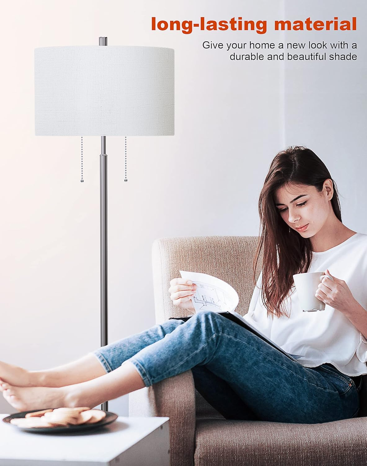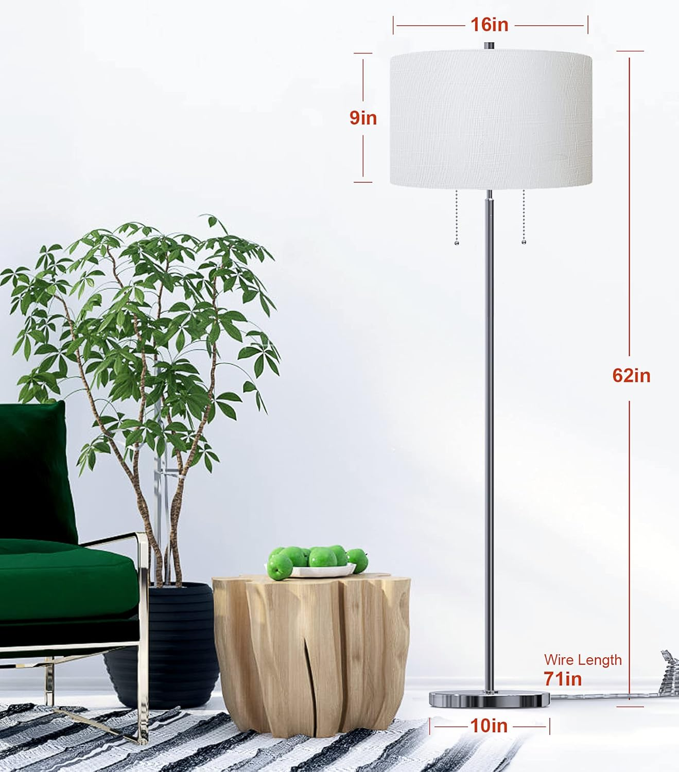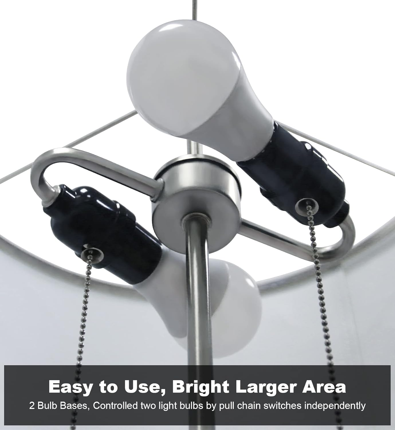 Store New Arrivals Add to Favorite View Feedback Contact Modern 2-Light Floor Lamp, Tall Standing Lamp with 2 Bulb Socket for Living Room Bedroom Office Bright Lighting, Brushed Nickel Body, White Lampshade Description Light Source Type Incandescent Style Modern Number of Items 1 Power Source Corded Electric Number of Light Sources 2 Control Method Touch Switch Type Pull Chain Batteries Included? No Lighting Method Incandescent Lamp Type Floor Lamp Number of Pieces 1 Room Type Office, Living Room Bulb Shape Size A19 Efficiency Energy Efficient Product Dimensions 16"D x 16"W x 62"H Material Nickel, Metal Installation Type Tabletop,Freestanding Is Discontinued By Manufacturer No Indoor/Outdoor Usage Indoor Bulb Base E26 Water Resistance Level Not Water Resistant Connectivity Protocol Homeplug Item Weight 10 Pounds Connectivity Technology Normal bulb Special Features pull_chain Special Feature pull_chain Shade Height 9 Inches Part Number 43239-134551 Shade Color white Mounting Type Floor Mount Color White Finish Type Brushed Wattage 60 watts Is Cordless? No Base Material Metal Is Waterproof False Shape Drum Voltage 110 Volts Batteries Required? No Shade Material Linen Finish types Brushed Included Components 2 E26 bulb sockets Size dual-socket DEEPLITE LED Floor Lamp contains 2 E26 bulb sockets, you can install maximum 60W x 2 or 100W x 1 bulbs (bulb not include). They are independently controlled by two pull chain switches, so you can install different watts or different color bulbs for the floor light. Turn on both of them when you need bright light for reading, working and crafting, or turn on one when you just need ambient light for relaxing Both LED and incandescent bulbs can be used on this standing lamp as long as they meets the maximum watts requirement. You can even install a warm white bulb with a daylight one. We recommend to use 9 – 15 watts LED bulbs on this standing pole light, they provide more lumens and save more energy Key Product Features Minimalist yet contemporary designed metal floor lamp: the whole body includes stem, base and pull chain are metal made and brushed nickel finished. The drum Lampshade of the modern floor lamp is made of durable fabric. The weighted metal base ensures it's safe even in kids rooms or with pets around The whole floor standing lamp is 60.5 inches tall and weigh 10 pounds. The cylinder lampshade measures 16 inches in diameter and 9 inches in height and the base measures 10 inches in diameter and 1.5 inches in thickness. The power cord is 6.5 ft long It is a functional and room décor stand up lamp to place next to bedside tables, bed, desk, couch, chair, suit for your living room, office, bedroom, study room. A good warranty is provided and if for any reason you are not satisfied with our products, please contact us to solve within 24 hours. Product Description The video showcases the product in use. The video guides you through product setup. The video compares multiple products. The video shows the product being unpacked. Features: 1. White linen fabric shade adds a touch of elegance and fashion to any room. The lampshade opens at the top and the bottom which diffuses sufficient lighting with a calm, ambient, cozy, comfortable, relax glow. Perfect for a living room, bedroom, office, dinning room, kitchen, nursery room, den, library and study room 2. With pull chain switches allow for easy access, you don’t have to reach as far to turn on/off 3. Contains 2 E26 bulb sockets, you can turn one bulb on, both on, one off, both off by the pull chains 4. Its simple yet classic design makes it easy to place in any room including industrial, mid century, modern, art deco, urban, retro, elegant and stylish, minimalistic, traditional, or even upscale rustic and contemporary décor 5. The fusion of modern and traditional style makes the lamp an eye catching piece that will impress your friends and family 6. The contemporary lamp is a house warming gift for friend, mom, dad, kids, teen girls on Thanksgiving day, Valentine’s Day, Birthday, Christmas, Black Friday 7. Home decor: The minimalist lamp is perfect for setting a relaxing mood and creating a comfortable living environment while enjoying coffee or drinking with friends and family, reading, knitting, writing, drawing, browsing social media, playing video games, watching TV 8. Easy to assemble, very sturdy The shade comes rolled up and you just need to snap it onto the shade rims, and screw the pole pieces into the sturdy base and bulbs socket. Then plug in the electric cord, pull the chain switches, it will light up your room 2 Bulb Bases Double the light output, operate both lights simultaneously or one light independently .So you can install different watts or different color bulbs for the floor light. Heavy Stable Base Our floor lamps are made of high quality metal and have a sturdy base,in addition to adding the right amount of cement sand to increase the weight of the base, therefore increases its stability and firmness. White Linen Fabric Shade Specification: Drum Shade Size: 16*16*9’’ Cord Lengtht: 73.6’’ Total Height: 60.5’’ Metal Base Size:10*10*1’’ Note: To clean, pls wipe with a soft, dry cloth, avoid use of chemicals and household cleaners as they may damage the finished ABOUT US We’re dedicated to bringing you great deals on quality products. From home décor and garden essentials to tools, hardware, and pet accessories, our store has something for everyone — all at prices you’ll love. SHIPPING We ship all orders directly from the USA for fast, reliable delivery. Most items ship within 1 business day and include free shipping to the lower 48 states. For international orders, we use eBay’s Global Shipping Program — simply continue checkout to see costs, duties, and taxes for your country. FREE RETURNS We offer a 30-Day Return Policy on items which you are not completely satisfied with. You have the option for a full-refund or an exchange of the item. CUS