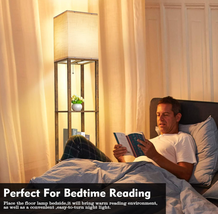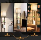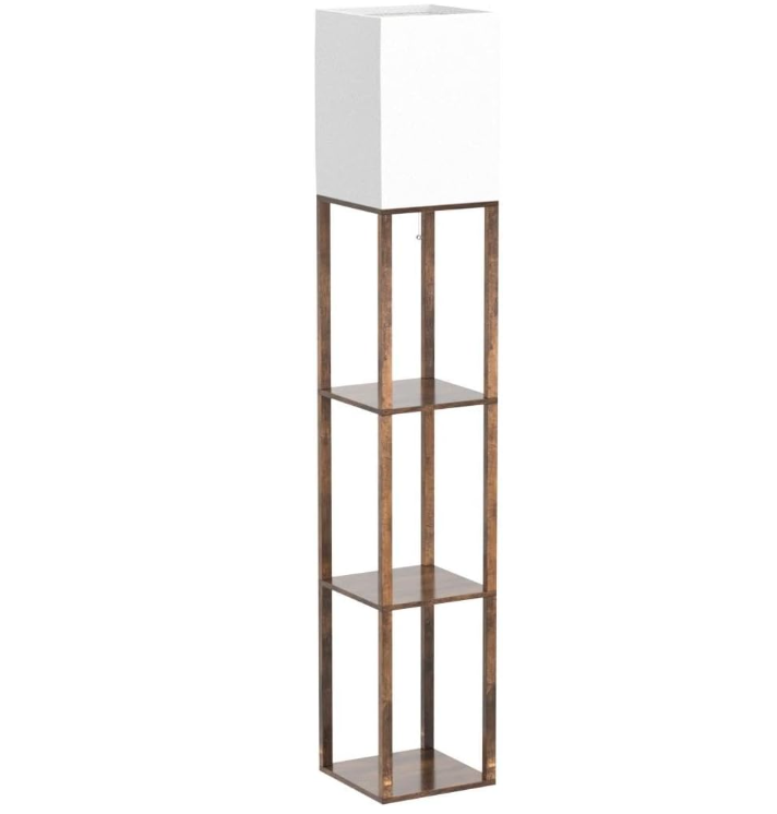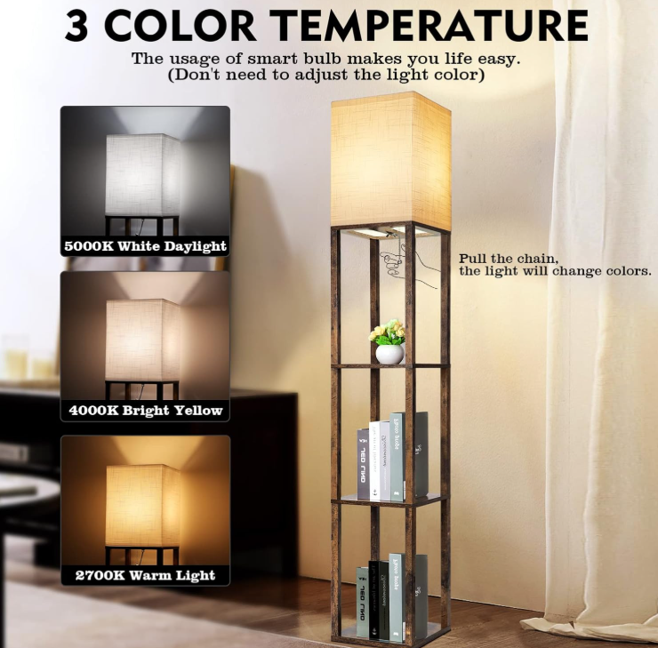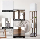 The Floor Lamp with Shelves is a modern and stylish addition to any living room or office space. With a combination of display shelves and a cozy off-white fabric shade, this LED floor lamp provides both functional storage and warm lighting. The rustic brown color and wooden finish add a touch of elegance to the room, while the pull chain switch and corded electric power source make it easy to use. This freestanding lamp is perfect for indoor spaces and offers a unique and functional design for decoration and illumination purposes.
