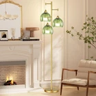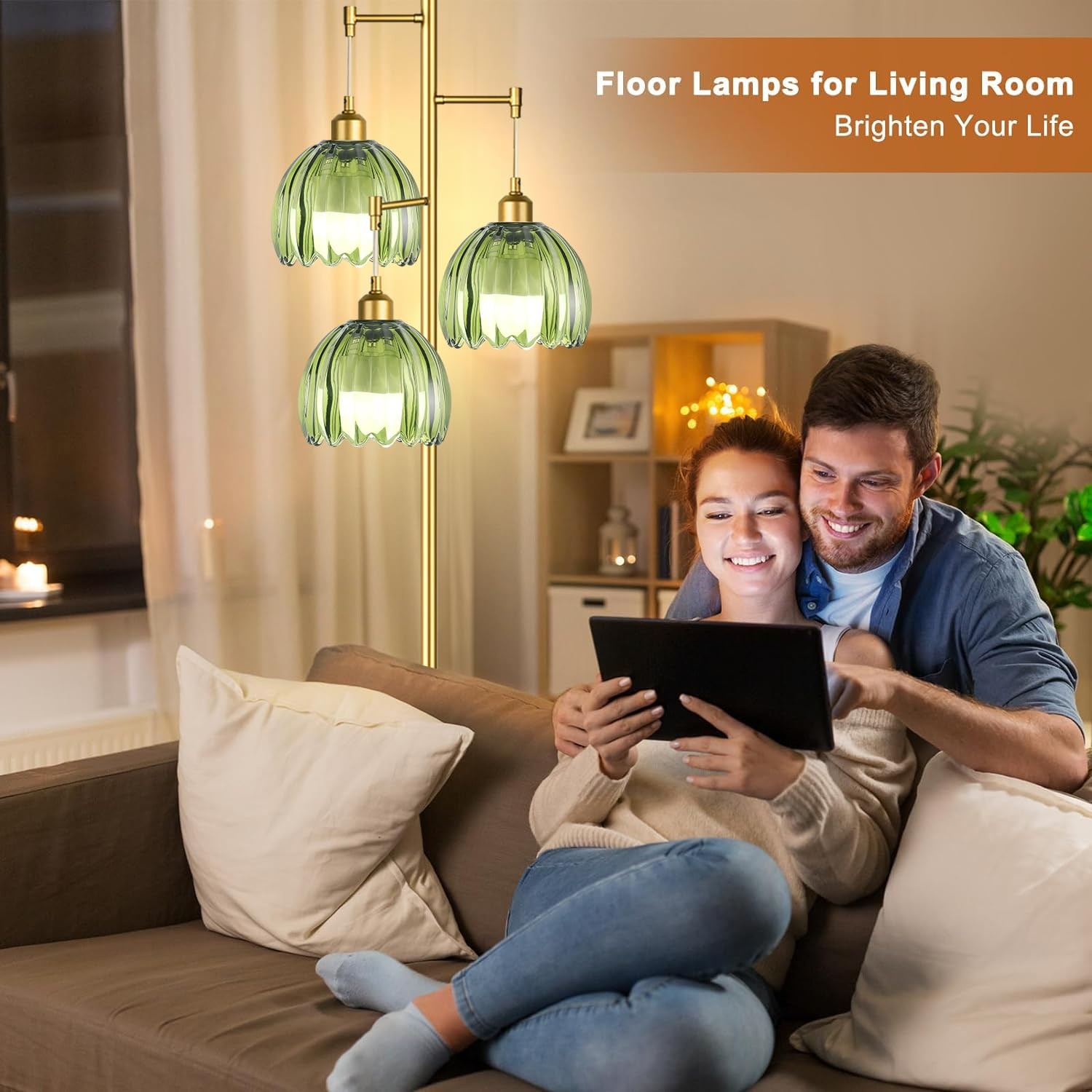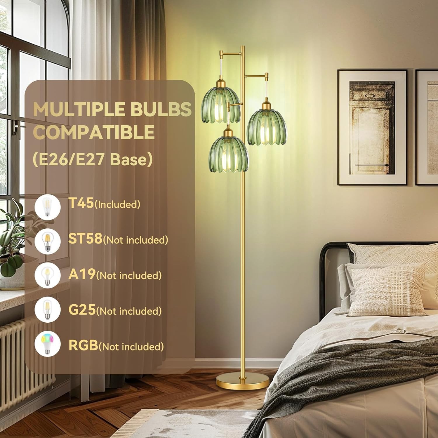 Modern Floor Lamp for Living Room Bedroom-3 Light Gold Floor Lamp with Glass Lampshape, Flower Tall Lamp Glass Standing Lamp Tree Green Floor Lamps for Living Room Bedroom,Office,Corner 【Elegant design 】Stained glass lamp have a firm-rust metal lamp pole matched with three lotus glass lampshade to make the tall floor lamp look stylish and delicate. The soft warm light creates a comfortable atmosphere. Compatible with various decorative styles such as New Nordic, mid-century, modern, classic, and artistic decoration. Bring different lighting experiences to your different styles of space. 【Safe and stable lamp base】 The floor lamp adopts a heavy metal base, which provides good stability and durability, prevents the lamp body from tipping over during daily use, and ensures the safety of children, the elderly and pets. You can also place the tall corner lamps on any type of flat floor, including plush carpets. Add a modern and high-end appearance to your living room, bedroom, study room, children's room, corner 【Practical and convenient pedal switch】 we specially chose the full socket foot switch design for the tall standing lamp, which frees hands and saves the trouble of bending over to turn off the lamp. You can turn on or off the floor lamp by simply pressing the switch. The extended 72-inch cord allows you to place the modern floor lamp wherever you want, such as near seats, sofas, side tables, and beds. 【Included Bulb】 Flower floor lamp for living room contains three led bulbs,You do not need to buy additional bulbs,and tree floor pole lamp have a heavy metal base,is designed to keep you and your family safe at home 【Easy to assemble】 All components are included in the package. The floor lamps for bedroom can be screwed together without tools. According to the installation sequence in the manual, the whole floor lamp can be easily assembled in a few minutes. if there is any defect or other question, please contact us via Amazon message box, we will reply within 24 hours. Help you solve all after-sales problems.