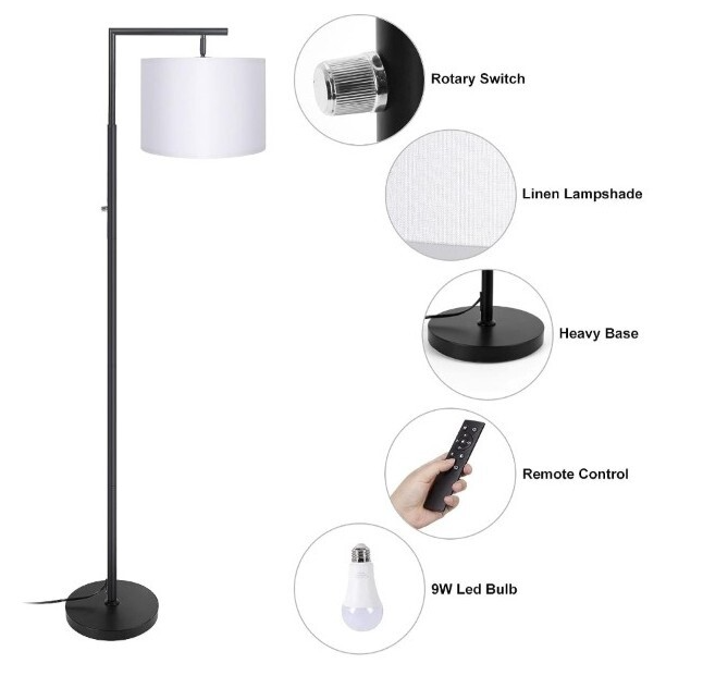 【50,000 Hours Long Life】The modern reading standing light includes a 9 Watt Bulb(Could replace a bulb 60W MAX), 1,000 Lumen, 3,000K/4,000K/5000K6,000K for different choose, gives you favorite brightness and color.A good choice for your reading which can protect your eyes.It is more money and energy for you. 【Remote & Rotary Control】With the remote control, you can easily control the floor lamp without leaving the sofa and warm bed.Adjust the brightness and color using by remote.You can turn on /off by the rotary switch directly,easy to operate and find it. 【Stepless Dimming】Adjust the color mode and brightness level by your remote control. The bright standing lamp offers stepless brightness settings up to 1000 Lumens,3000K-6000K Color Temperatures which suitable for all the room style and using situation ,find the perfect light for your needs. 【Safe Base For Your Children And Pet】This lamp is about 63 inches high ,with a heavier base that keeps it stable and won't tip over easily. The base of the floor standing lamp is made of metal which is not flimsy, heavy enough make sure children and pets' safety when they are playing in the room. 【Morden Design Works with Any Decor】Floor lamps with white shades help to illuminate your whole room and the simple design of the shade lamp matches your house and furniture well. The modern floor lamp is made of high-quality fabric drum shade, with metal pole,with rotary swicth and remote control design making it easier for you to turn on the light in the dark.