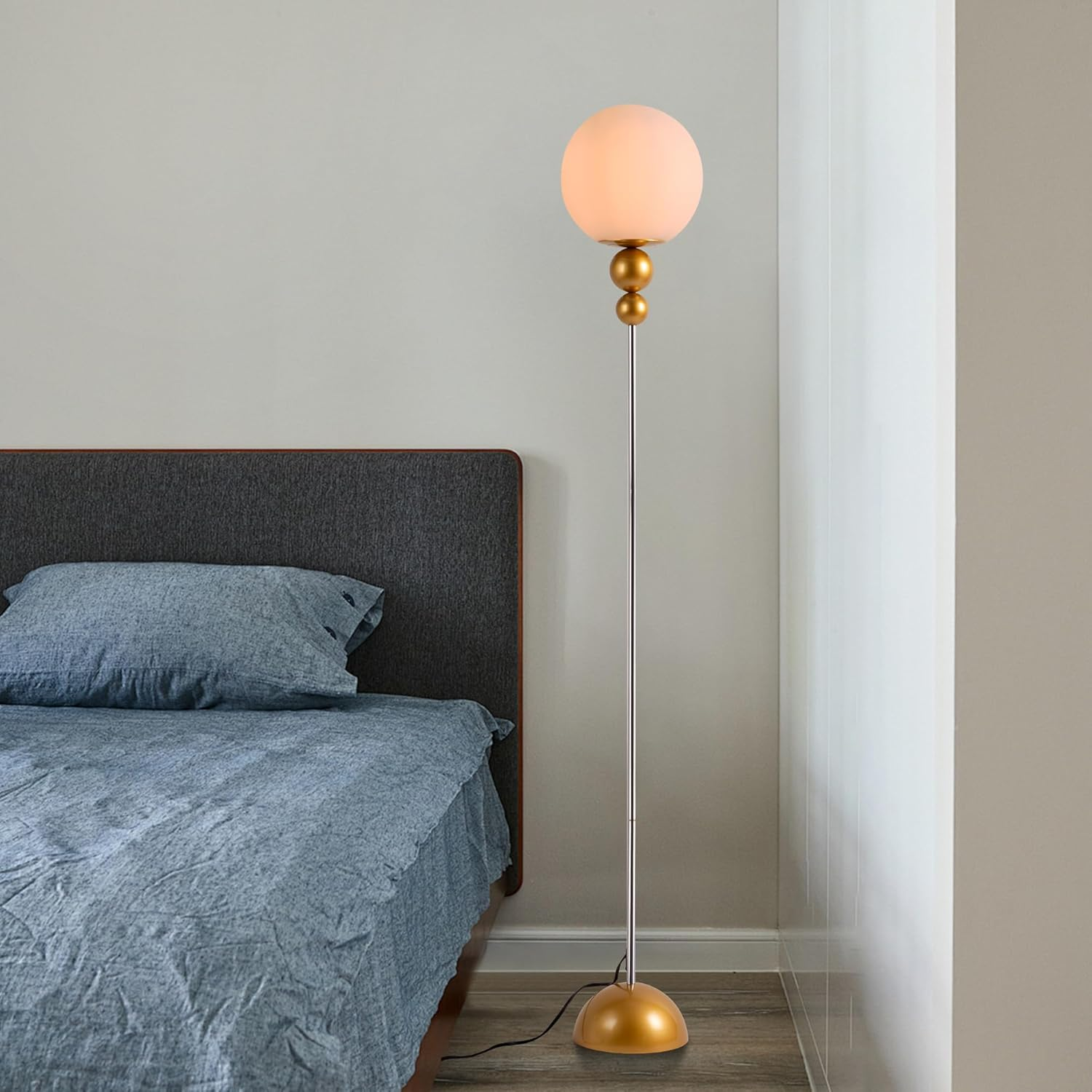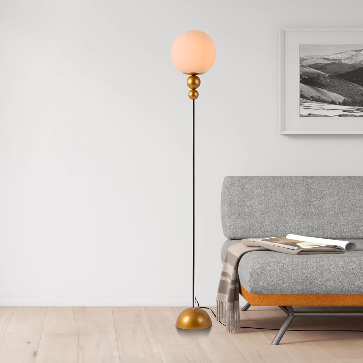 Store New Arrivals Add to Favorite View Feedback Contact Modern Floor Lamps for Living Room, Globe Glass Shade Floor Lamp for Bedroom, LED Standing Lamp for Office, Corner Description Item model number DL-2421-G Light Source Type LED Style Modern Power Source Corded Electric Number of Light Sources 1 Country of Origin China Batteries Included? No Lighting Method Uplight Lamp Type Floor Lamp Controller Type Foot Control Room Type Office, Kid‘s room, Living Room, Bedroom, Dining Room Assembly Required Yes Product Dimensions 9.45"D x 9.45"W x 65"H Material Metal Installation Type Freestanding Finish Type Painted Specific Uses For Product Reading, Decoration Indoor/Outdoor Usage Indoor Bulb Base E26 Water Resistance Level Not Water Resistant Batteries Required? No Item Weight 10 Pounds Special Features Corded Special Feature Corded Shade Height 9.44 Inches Part Number DL-2421-G Shade Color White Mounting Type Floor Mount Color Gold Wattage 40 watts Is Cordless? No Base Material Metal Is Waterproof False Shape Globe Voltage 120 Volts (AC) Recommended Uses For Product Reading, Corner Shade Material Glass Finish types Painted Included Components On-Off Switch, Power Cable, Shade Base Diameter 8.3 Inches Switch Type Foot Stylish Decorative Floor Lamp: chic design modern mid century floor lamp. Milky white globe glass shade with 2 beautiful metal orbs of different sizes decorating the lower end and domed lamp metal base. It's all a great decorative floor lamp choice to add a touch of elegant modernity to your room. This standing lamp has an elegantly detailed stem with a chrome plated finish, and the body is available in multiple selectable colors for art deco, modern, vintage, mid-century modern, and other decorative schemes. Widely Used Standing Lamp: This contemporary floor lamp has a slim body and a small domed base that can be effortlessly placed in tight corners without getting in the way. So this vintage floor lamp fits easily next to a desk, couch, nightstand, or bedside table. In the living room, in the bedroom, in the office, it works well for reading, work and hobby lighting. Smart Device Capable: This standing lamp is compatible with smart devices. Use your smart device to turn this lamp on or off. Spice up your lamp with a colored LED bulb or use the provided one to enjoy cozy, warm light and excellent illumination. Dimensions: the height of this floor lamp is 63 inches/160cm, the diameter of the globe glass shade is 9.45 inches/24cm, the diameter of the dome base is 8.3 inches/21cm, and the height is 3.9 inches/10cm.The length of the power cord with foot switch is 98 inches/250cm. Compatible Bulbs: E26 lamp base, compatible with various LED, CFL, halogen, incandescent bulbs. Maximum support 40W.Please Note: Bulb is not included in this item. Product Description Mid-Century Modern Glass Globe For Bedroom and Living room. Slim Floor Lamp with Small Dome Base Fits Any Corners & Compatible With Various Styles. Slim Floor Lamp with Small Dome Base Fits Any Corners & Compatible With Various Styles. Slim Floor Lamp with Small Dome Base Fits Any Corners & Compatible With Various Styles. 1 For Living Room 2 For Bedroom 3 For Office Soft Light Illuminates the Entire Room Lamp off, Showcasing Design By day: Your vintage-inspired statement piece. The opal glass globe & elegant finish bring authentic mid-century modern style to your space. lamp on, Showcasing Light By night: Your cozy haven, illuminated. Soft, warm light fills the room, wrapping you in comfort every evening. Product Dimensions Product Detail Milky Frosted Glass Lampshade Unique Metal Decor Sphere Sturdy Hemisph Metal Base ON/OFF Foot Switch ABOUT US We’re dedicated to bringing you great deals on quality products. From home décor and garden essentials to tools, hardware, and pet accessories, our store has something for everyone — all at prices you’ll love. SHIPPING We ship all orders directly from the USA for fast, reliable delivery. Most items ship within 1 business day and include free shipping to the lower 48 states. For international orders, we use eBay’s Global Shipping Program — simply continue checkout to see costs, duties, and taxes for your country. FREE RETURNS We offer a 30-Day Return Policy on items which you are not completely satisfied with. You have the option for a full-refund or an exchange of the item. CUSTOMER SATISFACTION We do everything we can to ensure every customer is 100% satisfied. If something isn’t right, just send us a message — we’ll make it right quickly!