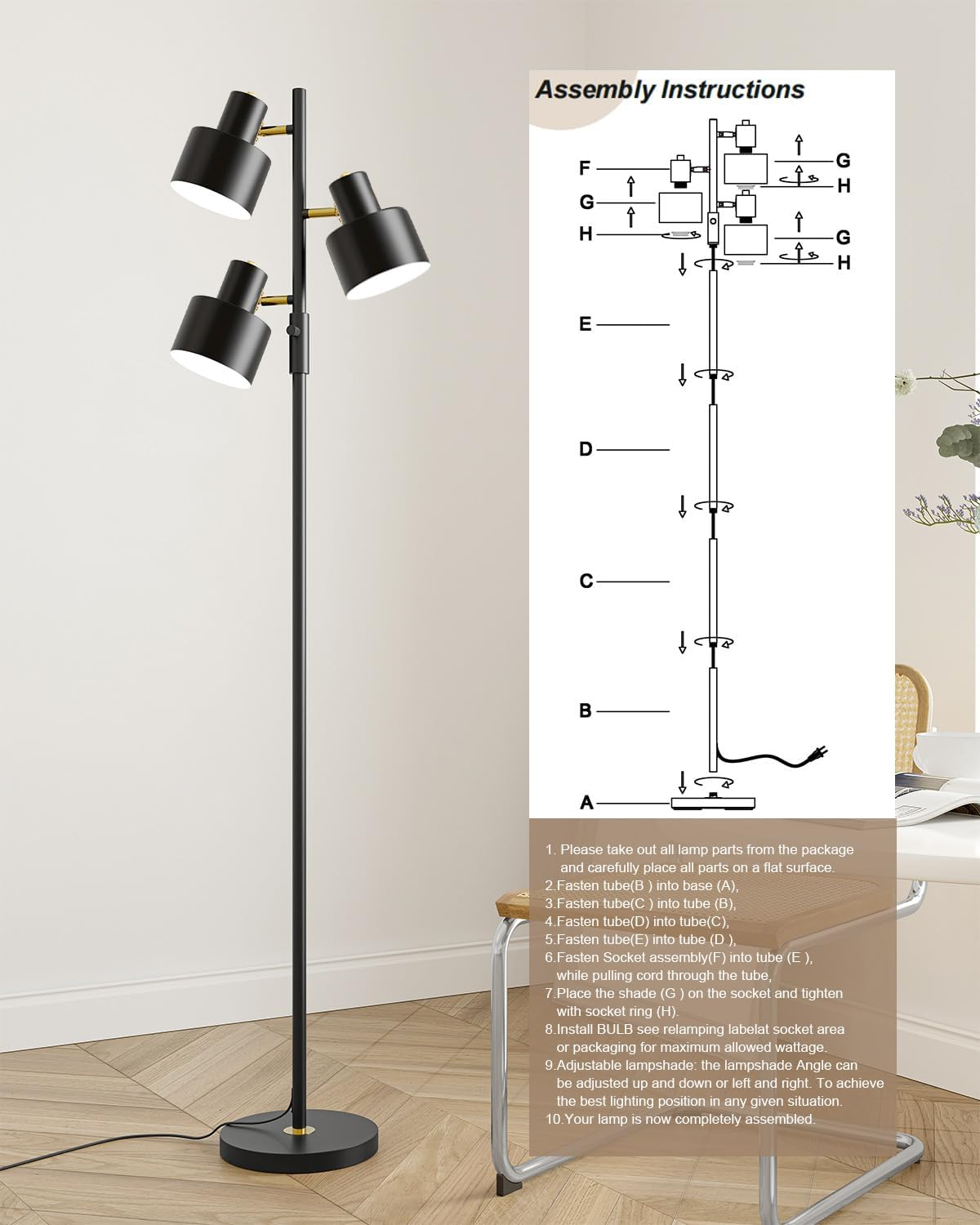 Floor Lamps For Living Room Bright Lighting -- The led floor lamp uses a unique 3-light design, each light supports 350° rotation and 180° vertical adjustment, supporting individual control of brightness. With its stylish design and minimalistic sleek lines, the floor lamp for bedroom fits well with modern, urban, casual, and artistic decor styles. Ideal mordern floor lamp, bedroom, office, study, bar, club, restaurant, etc. Multifunctional Standing Lamp -- This black floor lamp light source is stable without flickering, and creates a soft and smooth atmosphere with light. Prevent eye fatigue, and maintain an even frequency of light delivery, with a purer light. This corner floor lamp bright lighting is designed for a retro and elegant look that adds a aesthetic decor with beautiful soft ambient light to any space.For plant enthusiasts,this modern floor lamp doubles as a grow light floor lamp, providing the perfect illumination for indoor plants to thrive. Convenient Reading Lamp: Rotary ON/OFF switch on the lamp-post is convenient to turn on/off the tall floor lamp without having to get up and press a wall switch, it fits for any corner on your bedroom or living room.This floor lamp uses a universal E26 lamp holder and is compatible with a variety of bulbs, such as CFL,RGB,Suggest use Edison bulb. Support up to 40 watts maximum. (Note: Bulbs not included) Easy Assembly & Certified Safety: Quick and simple installation—just follow the included instructions to assemble the lamp pole. The lamp’s cord, socket, and plug are UL listed for safe daily use. To ensure a smooth setup, installation step diagrams are available both in the product packaging and on the product page. We kindly recommend reading the manual before assembly to help avoid any installation issues. We kindly recommend reading the manual before assembly to help avoid any installation issues.If you have any questions during the installation process, please feel free to contact us and we will be happy to help you. Quality Materialst & Warranty:Crafted from durable metal with a matte black finish. While we strive for premium quality, slight surface imperfections or minor variations in finish may occur due to the metal crafting process. These do not affect performance or safety.The task lamp includes a 1-year limited warranty. If you encounter any issues, including surface defects or performance concerns, our support team is ready to help. We are committed to ensuring your satisfaction. Product Description OYEARS Floor Lamp OYEARS Flexible Floor Lamp for Living Room The video showcases the product in use. The video guides you through product setup. The video compares multiple products. The video shows the product being unpacked. video Merchant Video 1 Flexible Lamp Head 2 Three Light Modes 3 Sturdy Metal Base 1 For Reading 2 For Bedroom 3 For Corner 4 For Living Room Easy-installed Floor Lamp