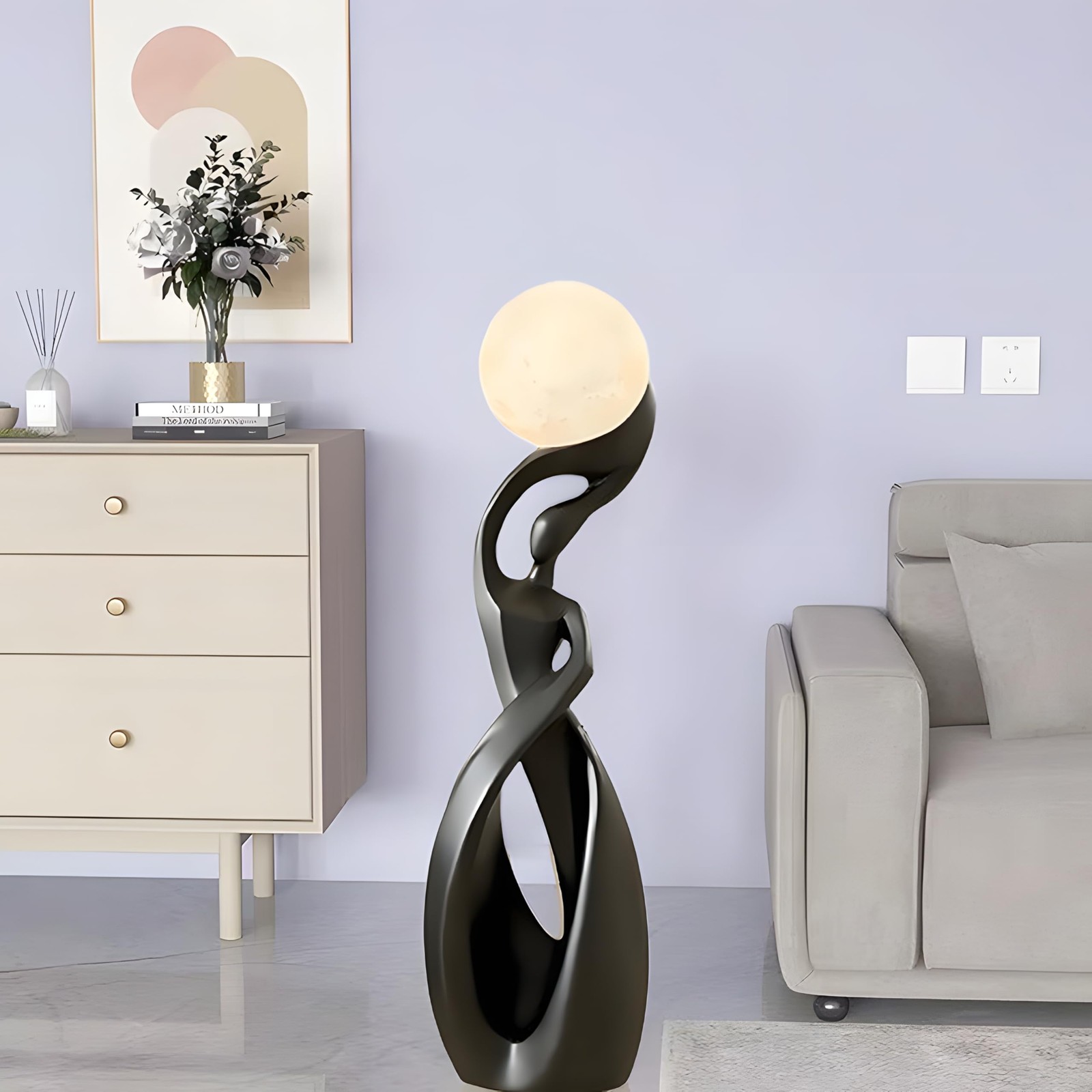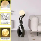 Product Description Color :Black Wattage:12W Voltage:110V Materials:Resin Type:Floor Light Product Dimensions Fixture Weight:8.8lb (4kg) Fixture Length:9.44" (24cm) Fixture Depth:9.44" (24cm) Fixture Height:32.68" (82cm) Bulb Information Number Of Bulbs :1 Light Source:LED Consumer Service The warranty period of the product is 24 months.If you are not satisfied with your purchase, please feel free to contact us. We offer you an excellent after-sale service. As your satisfaction is our priority, we are committed to making it right for you. 3D Printed Moon Floor Lamp:Our unique moon floor lamp has a 95% similarity to the real moon, capturing its texture and creating a realistic lunar ambiance,The warm light and elegant design can match various styles of homes, such as mid-century, retro, modern, contemporary, farmhouse, etc Convenient USB Charging & Button Control:Equipped with a built-in USB rechargeable port at the base, this moon lamp offers hassle-free charging and eco-friendly operation. A sleek button near the charging port allows you to power on/off the lamp.After pressing the button to activate the lamp, simply gently tap the moon’s surface to enjoy through a spectrum of mesmerizing colors (4+ options!).this moon light responds to your touch, making it a fun and engaging decor piece for kids and adults alike. Its durable, lightweight design ensures safe handling, while the realistic lunar texture adds a cosmic aesthetic to any room. Modern Decor Floor Lamp Size & Material:Size is:9.44 inch x 9.44 inch x 32.28inch.(The height of the lamp body is 26.77"/68cm, and the diameter of the lunar lamp is 5.91"/15cm).Floor lamps for living room are made of resin and 3D Printing Frosted Shade, fashionable and exquisite,fashionable shape, strong and stable. The abstract floor lamp for office super save space, you can put it under your sofa or narrow corners as your like Wide Application:The industrial appearance and sturdy materials make this nordic floor lamp suitable for various places, perfect art deco lamp for your bedroom, living room, farmhouse, hotel, etc Customer Service:Click our store name "" for more choices. If you have any questions or suggestions after receiving the black floor lamp, feel free to contact us for a prompt response