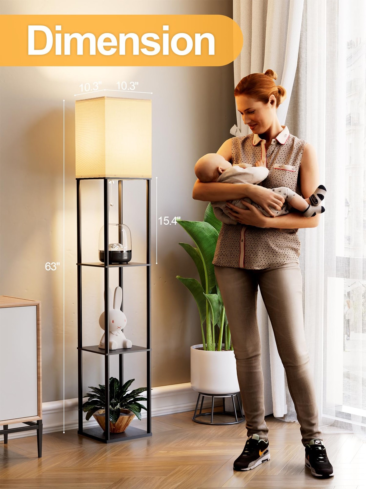 Floor Lamp with Shelves for Living Room, Shelf Floor Lamp with 3 CCT LED Bulb, Corner Display Standing Column Lamp Etagere Organizer Tower Nightstand with White Linen Shade for Bedroom, Office PARTPHONER floor lamp with shelves MORE BENEFITS Open top design with more brightness: This tall standing lamp assembled size is 10.3" L *10.3" W*63" H. It is designed with open top design to shed more light on your room. 3 color temperature bulb with memory function: shelf lamp includes a 9 Watt, 800 lumen energy saving LED bulb. The LED bulb has 3 color temperatures: 2700K/4000K/5000K. You can switch different color temperatures by pulling the pull chain twice within 10 seconds. Also the led bulb has memory function, it will remember the light color last time you chose. 3 tier storage and display: Our floor lamp with shelves is made of sturdy wood with stable structure, high loading with 50 lbs max loading capacity. This floor lamp adds ambiance to your room and provides a storage or display area for vases, books, plants, albums or other items. Wide application: this shelf floor lamp is a perfect holiday gift and birthday gift for mothers, fathers, wives, husbands, children, and friends. It's suitable for beside a sofa, tv stand, fish tank in the living room, reading in the bedroom or reading room, office, library, kitchen, coffee shop, hotel, restaurant, etc. Assemble easily in 10 mins: the package comes with the tools needed for assembly and an instruction manual containing text and video installation steps. Simply follow the steps to assemble the shleves and poles in 10 minutes.