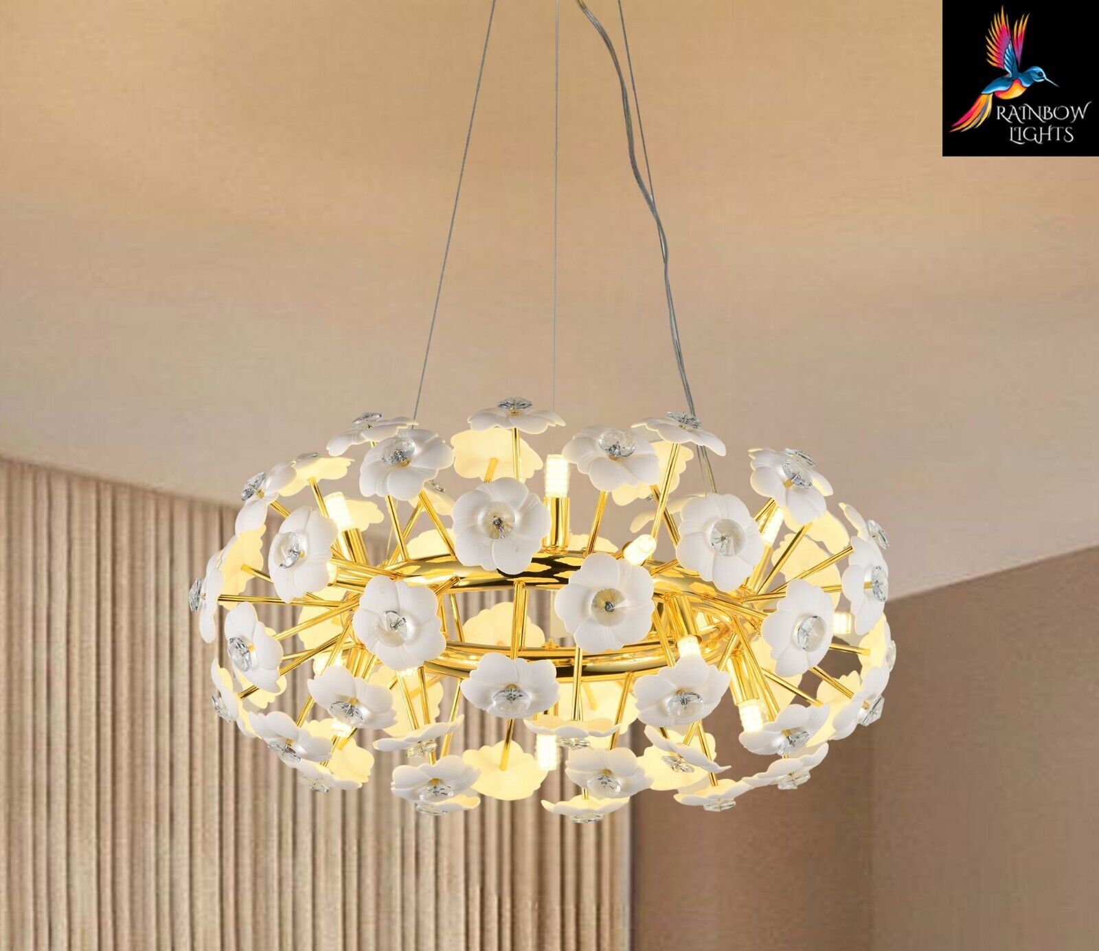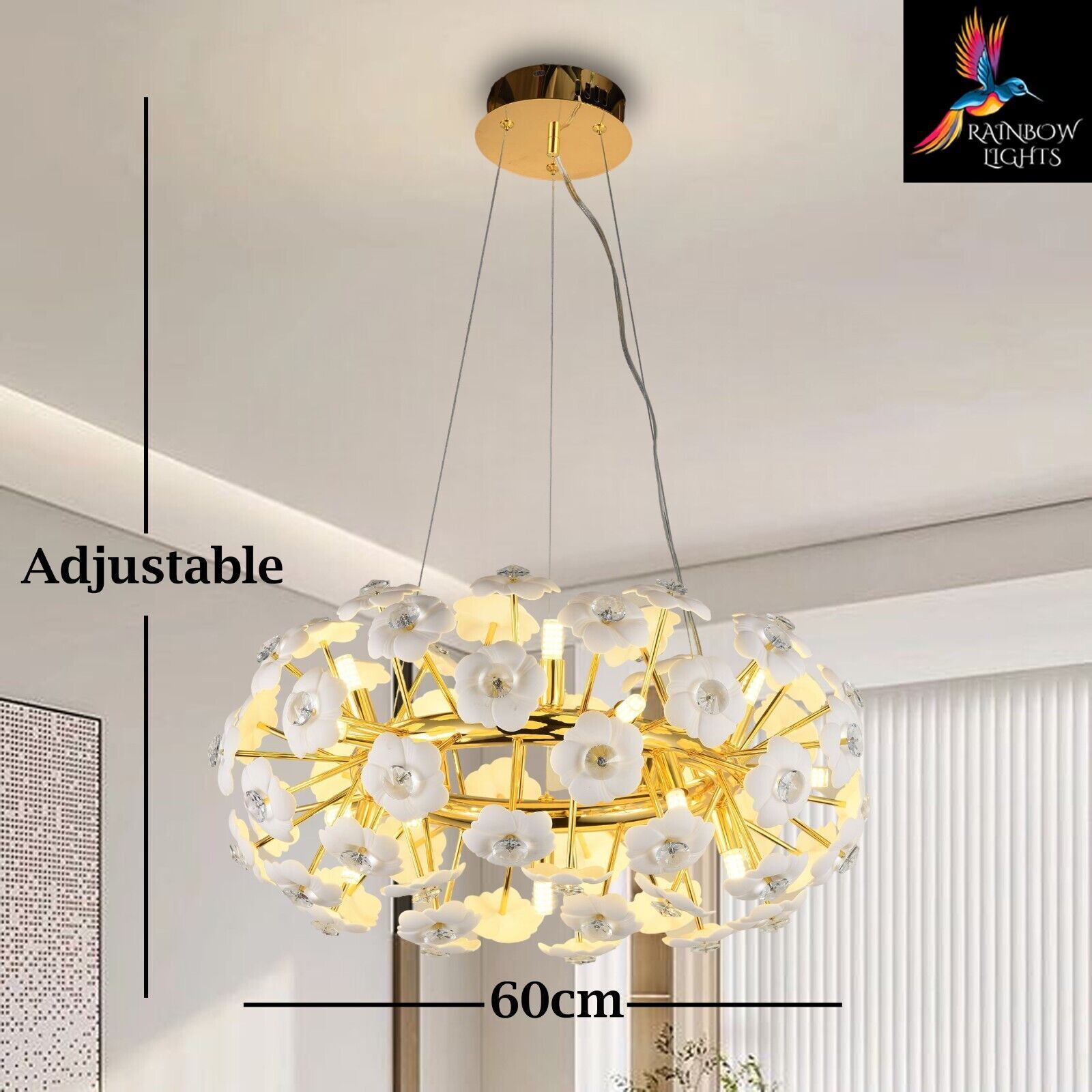 Introducing the latest addition: the Starburst Round Shaped Ceramic Flowers Sputnik Style Chandelier. Enhance your home with these exquisite luxury lighting fixtures from Rainbow Lights. Product Details: Condition NEW Material Ceramic + Crystal + metal Width/Diameter 60 cm Height Adjustable Product Type Starburst sputnik Light Style Contemporary Shape Round Number Of Bulbs 15 Bulb Type G9 Lamp Wattage 40 Voltage AC110-240V - 50/60Hz Lumens 80-100 CCT 3000K(Warm White) Light Source LED Shade Clear Specific Uses Indoor Weight 6.5 kg Modern Chandelier, Crystal Chandelier, Light Fixtures, Hanging Lights, Farmhouse Chandelier, Antique Chandelier, Vintage Chandelier, Round Chandelier, Ceiling Lights, Luxury Chandelier, Pendant Light, Modern Lights, glass chandelier, Sputnik Lights. Crystal Chandelier Lighting - Crystal Pendant Lighting - Kitchen island Hanging Light - Dining room Pendant Light - Foyer Chandelier lighting - Bedroom Pendant light Listing and template services provided by inkFrog