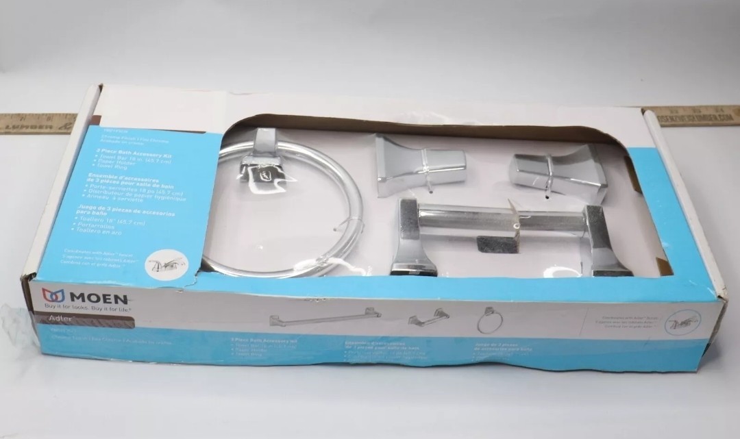 The Moen YB0193CH Adler 3-Piece Bath Hardware Set with 18 inch Towel Bar in Chrome is a stylish and modern accessory set perfect for adults in the bathroom. The set includes a towel set, toilet paper holder, towel ring, and towel rack, all in a sleek chrome finish. The elegant silver color and contemporary design make this set a great addition to any bathroom, adding a touch of sophistication to your home decor. The high-quality Moen brand ensures durability and reliability for years to come.