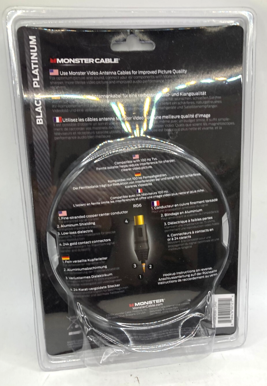 Monster RG6 Antenna TV Cable 1.5m Black Platinum Monster cable black platinum RG6 Antenna Cable designed for high quality picture and sound. Features dual-layer shielding to protect against signal interference and gold-plated connectors for enhanced signal transfer and corrosion resistance. New and sealed.