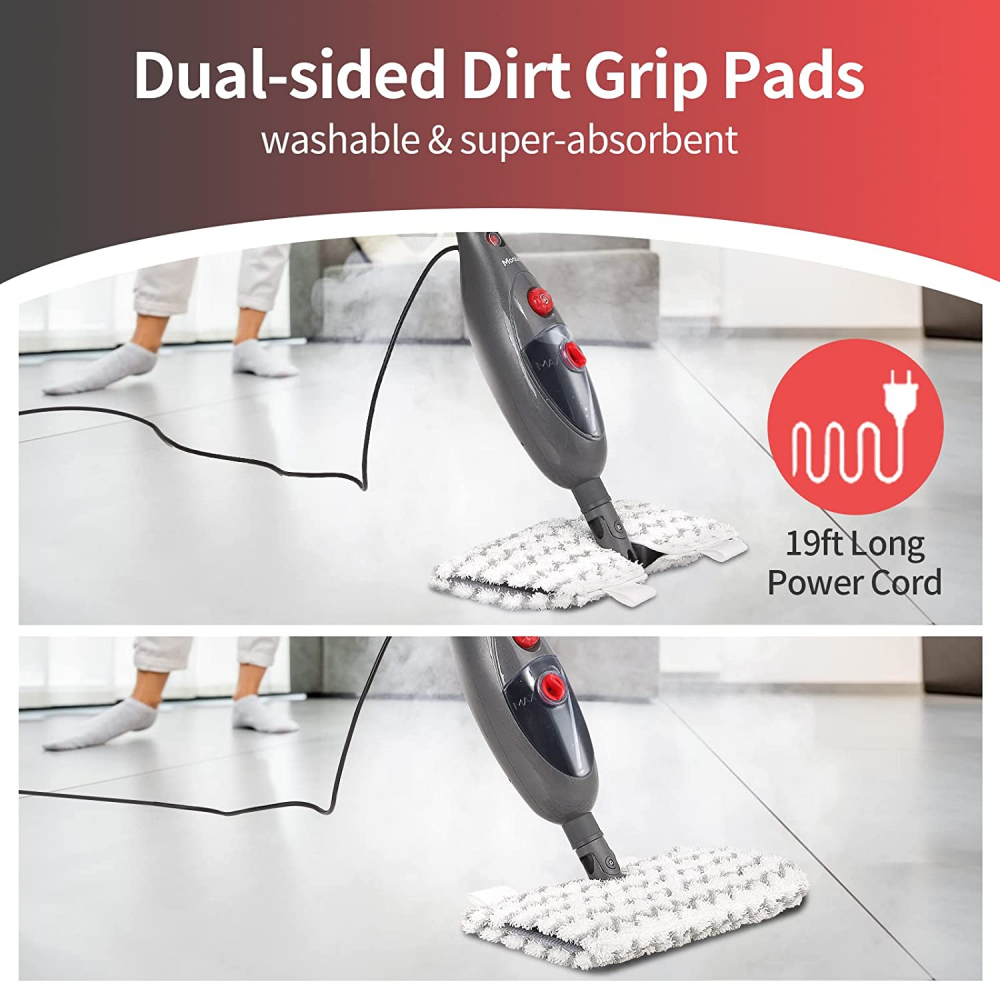 Moolan Steam Mop, Professional Floor Steamer Cleaner with Dual-sided Dirt Grip Pads for Hardwood Grout Tile Deep Cleaning, 12-in-1 Lightweight Steam Mop for floor Cleaning, Sticky & Stubborn Stains Product Details Package Dimensions: 19.8 x 7.7 x 6.7 inches Item Weight: 5.24 pounds Brand: Moolan Surface Recommendation: Hard Floor, Upholstery Included Components: 1* steam mop, 1* dual-sided dirt grip pads, 1* flat head cleaning tool, 1* gap tools, 1* jet nozzle, 2*round brush, 1*Window Squeegee, 1* fabric steamer cloth, 1* pressurized nozzle and 1* measuring cup1* steam mop, 1* dual-sided dirt grip pads, 1* flat head cleaning tool, 1* gap tools, 1* jet nozzle, 2*round brush, 1*Window Squeegee, 1* fabric steamer cloth, 1* pressurized nozzle and 1* measuring cup1* steam mop, 1* dual-sided dirt grip pads, 1* flat head cleaning tool, 1* gap tools, 1* jet nozzle, 2*round brush, 1*Window Squeegee, 1* fabric steamer cloth, 1* pressurized nozzle and 1* measuring cup See more Capacity: 400 Milliliters Style: Modern [Innovative Steam Cleaner] Works as a floor steam mop or a handheld steamer, satisfy all your cleaning needs. Low profile mop foot and swivel steering to easily maneuver under and around furniture and other obstacles. Powerful steam ready in just 15 seconds. [Dual-sided Dirt Grip Pads] Lift and lock in dirt with specially designed strips of gripping material that are woven throughout the steam mop cloth,which is different from ordinary steam mop. Thicker material, super water absorption enhances the cleaning effect with fast dry times. Dual-sided reduces your time to change the mop cloth. [Auto Steam for All kinds of Floor] Choose from high to low steam based on your cleaning needs with the adjustable dial. Moolan steam mop can be used on hardwood floors, tiles, grouting, laminates and ceramics,etc. 400ML visualized large-capacity water tank, save your time to add water. [Deep Cleaning steamer] 230°F fast and hot steam to remove dirt, grime, grease, stains and mold on various indoor and outdoor surfaces. Just use water for chemical-free cleaning. Nice for your children, pets or yoga lovers and all family.