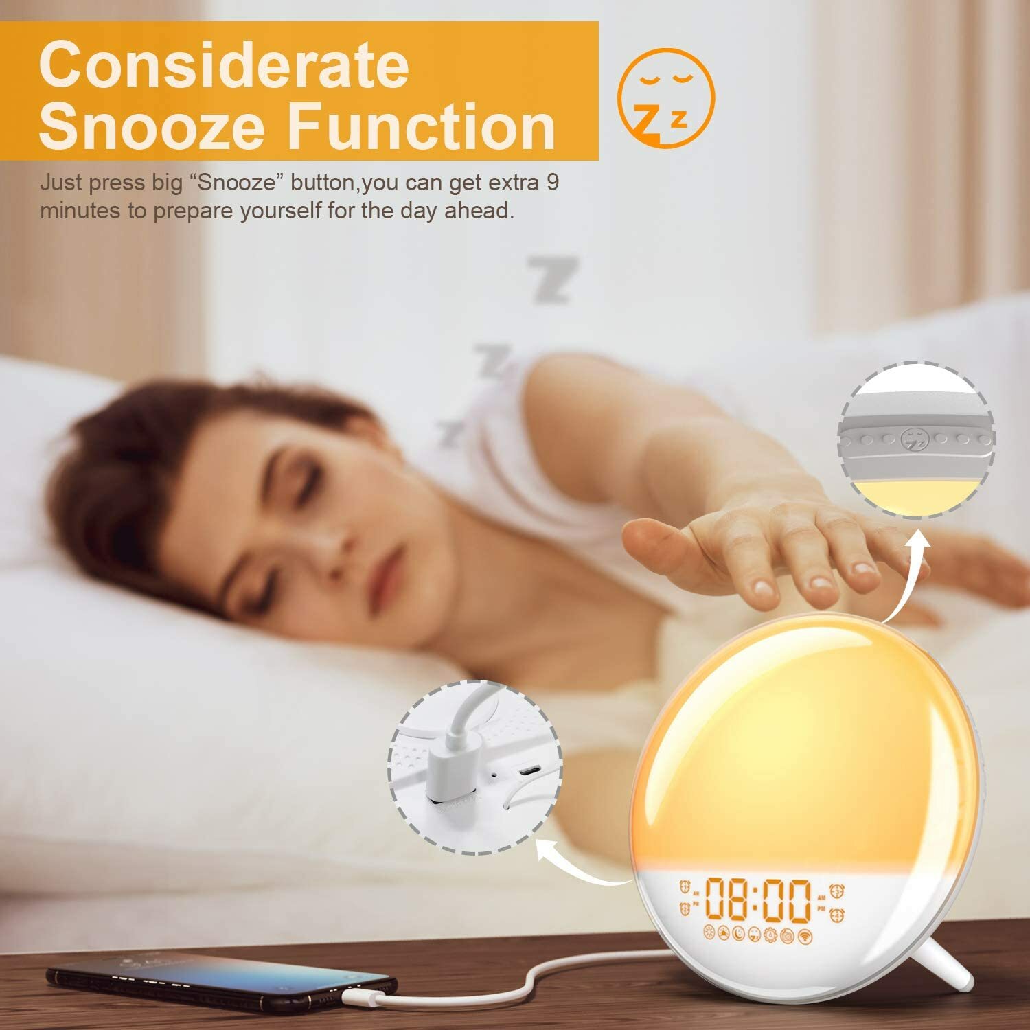 Brand AMTOK Are Batteries Included Yes Shape Round Batteries 1 Lithium Metal batteries required. (included) Mounting Type Tabletop About this item ⏰【Smart Alarm Clock & Voice Control】With wifi connection, mobile APP control wake-up light. You can set 4 alarms, choose wake-up themes, select light intensity, and control your sounds and radio, gives you total control of your experience. It also works with Amazon Alexa and Google Assistant. ⏰【Sunrise Simulation Wakes You Gradually】Inspired by natural sunrise, Wake-up lighting starts red and gradually turns into a bright yellow with 20 Brightness within 10~60 minutes before your chosen wake-up time. It wakes you up slowly, gently pulling you out of slumber, helping you to wake up feeling happier and calmer. ⏰【Considerate Snooze Function】Easily snooze by tapping the top of the light to turn off sound so you can doze 9 minutes. Save space with the USB port to power up mobile phones, tablets or electronic devices. ⏰【Sleep Aid Feature & Mood Light/Bedside Night Light】Sunset setting with lights and sounds that adjust the atmosphere in your room so you can drift off to sleep. Also, you can switch the display to automatic, keep bright or off if you prefer a completely dark room at night. The light has 7 colors that make the clock double up as a bedside night light or mood light. ⏰【FM Radio & 7 Natural Sounds】The alarm clock can pair the light with 7 natural sounds (like that of Bird, Ocean, Valleys Echo, Piano, Soft, Ringing, Beep) or with the FM Radio – where you can automatically save your favorite channels to a playlist and even set one as your wake up call.
