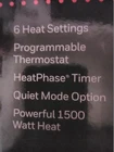 Model - HCE845B NO STOCK PHOTOS NEW Easy to use digital controls with LED display Programmable thermostat 6 heat setting options for customized comfort Tip-over protection automatically shuts the heater off if tipped in any direction Cool touch handle and housing Overheat protection High quality, heat resistant plastic Stable, sturdy base Personal Setting: Top only heating for comfort when seated or relaxing Room Setting: Total heating for whole room comfort Floor Setting: Bottom only heating to warm floor or cold feet Quiet Mode: A heat setting that combines gentle white noise with soothing warmth Provides a subtle background sound to sooth and relax NEW HeatPhase Timer - a phased 30 minute - 2 hour auto-off timer that adjusts heat down a level every 30 minutes until the heater turns off Original owner FREE shipping insurance included