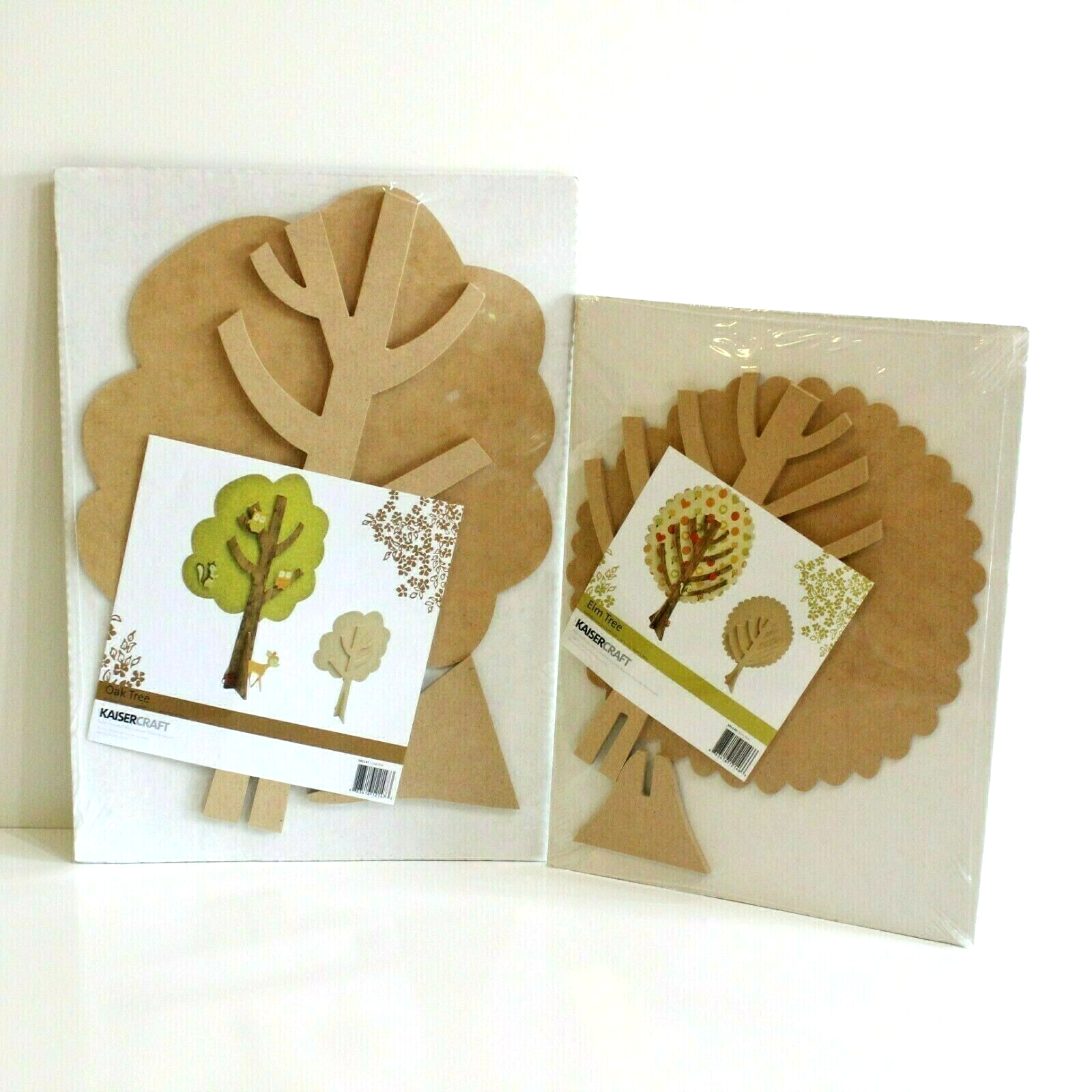 New in Package KaiserCraft Oak Tree & Elm Tree DIY Craft Kit Lot This craft kit includes two large blank MDF wooden press-board type cut out trees including one oak tree and one elm tree. They are amazing quality and are dimensional. Add your own creativity and embellishments to make into trendy home decor. Includes blanks only. Embellishments not included Dimensions Oak Tree: 19" tall x 12" wide Elm: 13" tall x 10" wide Some slight assembly required