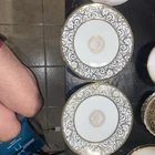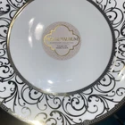 This is a set of two luxury dinner or salad plates in a white color with metallic silver accents in a swirl pattern. The plates are made of porcelain and have a diameter of 11 inches. They are from the brand House of Aurum and have a luxe style. The plates are suitable for occasions like Easter, Christmas, or any spring event.