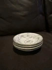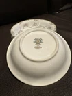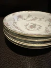 This elegant set of four dessert bowls by Noritake features a beautiful Windsor pattern with gray scrolls and pink and blue flowers. The bowls are made of high-quality porcelain and have a glossy finish. Each bowl is 5.5 inches in diameter and has a gold trim on the edge. This set is perfect for all occasions and is a great addition to any mid-20th century collection. The bowls were manufactured in Japan in the 1950s and are an original Noritake product.