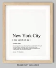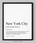 This wall print features a replication of a dictionary definition of the city of New York! PERFECT GIFT! This wall print is a perfect gift for mom's, dad's, men, women, friends, sister, brother or for yourself! It is great as a Mother's Day gift, Father's Day gift, anniversary gift, birthday gift, or at any time of year! READY TO FRAME - Frames to fit these 8x10 inch print is easy to buy here on or at any department or craft . Choose the frame color, width & mat sizes that work with your decor for the perfect look in your home! QUALITY PRINTS, MADE TO LAST - Our designs are printed on Crystal Archive Type II photographic paper (light sensitive and long-lasting). It has a luster, flat matte finish with a slight, subtle sheen and a minimal texture that brings a nice depth and quality to the artwork. Ready to be framed! PROTECTIVE PACKAGING FOR SAFE SHIPPING Prints are packaged & shipped in a sturdy 'stay-flat’ envelope specially designed to protect photographs and artwork during shipping. However, if a print is damaged during transit (these things happen!), just get in touch and we’ll ship a right away.