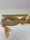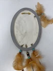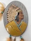 This Native American Chief wall plaque is a ceramic art piece featuring a hand-painted design with a dream catcher motif. Made in the United States, it showcases a Native American Indian theme and is signed by the artist. The multicolor plaque is a unique and handmade art pottery item that captures the essence of Native American culture. Really nice piece of Native American art. Signed by artist.