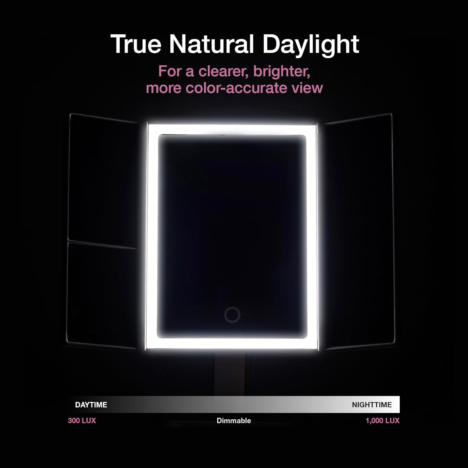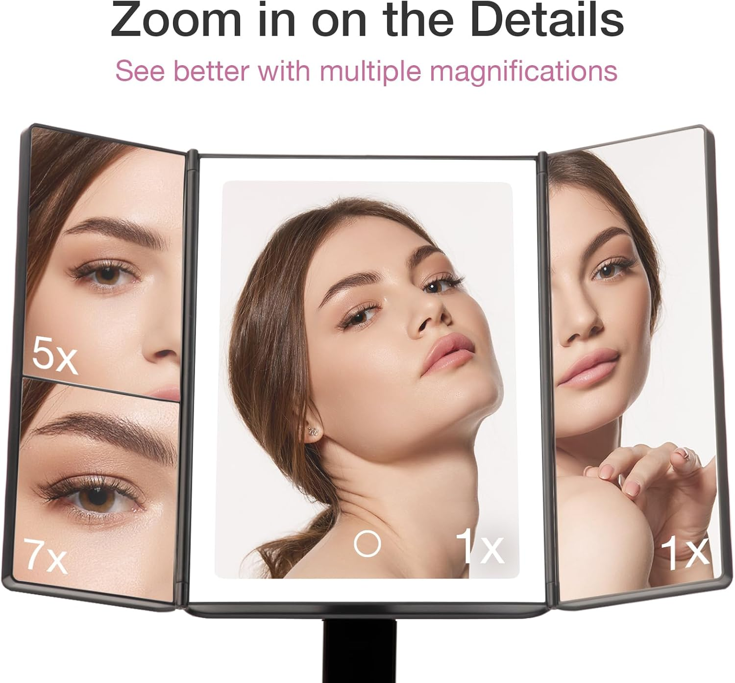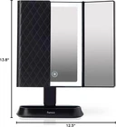 Store New Arrivals Add to Favorite View Feedback Contact Makeup Mirror with Natural LED Lights, Lighted Trifold Vanity Mirror with 5X & 7X Magnifications - 40 Dimmable Lights, Touch Screen, Cosmetic Stand - Sora (Black) Description Please DO NOT open a return request or leave negative feedback without asking for help. We are unable to ship to PO box addresses. Kindly provide your physical address. Item model number Espejos de Maquillaje Style Traditional Number of Items 1 Magnification Maximum 7 x Theme Travel Frame Color Black Number of Pieces 1 Room Type Dressing Room Assembly Required No Batteries required Yes Material Glass Frame Material Glass Is Discontinued By Manufacturer No Specific Uses For Product Jewelry Item Weight 2.11 pounds Surface Recommendation Glass Special Feature touch_sensor, adjustable, dimmable, foldable, trifold, lighted Mounting Type Tabletop Mount Color Black Finish Type black Shape Rectangular Finish types black Frame Type Framed Product Dimensions 13.8"L x 12.5"W Size 13.8"L x 12.5"W Natural Daylight LEDs - 2x brighter and softer illumination than the next best. 58 built-in dimmable LEDs closely mimic soft, natural sunlight providing you with true-to-life color-correct details. Wide Viewing Area - larger than average 3-panel ultra-reflective mirrors provide multiple viewing angles, so you always look (and feel) your very best! 180° rotation, fully adjustable to any desired position. Exceptional Clarity - Our premium distortion-free glass is ideal for creating flawless makeup looks and hair styles while the 5x and 7x magnifications are perfect for close-up and detailed work. Travel Friendly - Mirror stands 12.5" (32 cm) tall and 13.8" (35 cm) wide, mounted to a detachable cosmetic organizer base for storage of your makeup, jewelry, and more! Three panel mirror easily folds for ultimate portability. Dual Power - Energy-saving smart LED lights turns off automatically after 30 minutes; powered by an included USB cable or 4 AA batteries. Natural Daylight. Natural You. 40 ultra bright, energy-efficient LEDs mimic the effects of natural sunlight. Our daylight LEDs are 2x brighter and has softer illumination than similar models - it won’t burn out like traditional incandescent bulbs! Dimmable light function uses touch sensor technology to ensure that you always have the right amount of light, even under dimly lit conditions. Larger than Average You asked. We listened. We created a makeup mirror that is 20% larger than similar models. With an industry-leading 13.8 inch wide 3-panel mirror, our premium glass offers no distortion and is crystal clear from side to side providing you with a true-to-life color corrected view. Trifold Design Three-panel foldable mirror allows you to see yourself from multiple angles, so you always have the perfect viewpoint. It can be easily folded for convenient storage and travel. The construction of the weighted base is sturdy and strong, ensuring a stable platform that stays in place. 5X and 7X Magnifications Two powerful magnification options in one vanity mirror ensure every detail of your face, hair and makeup is in perfect place. The large normal mirror is great for viewing your entire profile while the 5x and 7x mirrors are suitable for close-up and detailed work. Cordless & Portable Our beautiful makeup mirror is perfect for use on tabletops, vanities, and countertops, but can also fit in your suitcase with its easily detachable base, making it a perfect travel companion! Battery or USB plugin operation means you can take it anywhere! Features Natural Daylight LEDs LEDs last up to a lifetime* Dimmable Function 30 mins AUTO shutoff 3 panel premium glass Large 1X normal view 5X, 7X magnifications Cosmetic Organizer Base 12.5" x 13.8" wide ABOUT US We offer the best prices around on high quality products. Our E-store includes media such as books, movies, music and games while offering electronics, toys, sporting apparel, clothing, tools, general home, garden items and more. SHIPPING We are always working hard to ensure your package arrives as soon as possible. Please understand that some factors like weather, high postal traffic, and the performance of shipping companies are outside of our control. We offer free shipping to the lower 48 states and ship within 2 business days of payment, usually sooner. We do not accept P.O. Boxes. Please provide a physical address. For shipping outside of the continental USA, we only use eBay's Global Shipping Program.The item is shipped to KY and then sent to the rest of the world. International customers are responsible for all duties and taxes. Continue to check out in order to calculate costs for shipping the item to your country. Messages regarding eBay's Global Shipping Program MUST be directed at eBay EXCLUSIVELY. Please DO NOT open a return request or leave negative feedback without asking for help. We are unable to ship to PO box addresses. Kindly provide your physical address. RETURNS We offer a 30-Day Return Policy on items which you are not completely satisfied with. You have the option for a full-refund or an exchange of the item. No returns are available on items shipped outside of the USA. PAYMENT We accept PayPal. CONTACT US This page content is yet to come Please ad us to your favorite seller and visit again later Thank You CUSTOMER SATISFACTION We try our very best to make sure every customer is completely satisfied. If there's a problem, message us! We're happy to help.