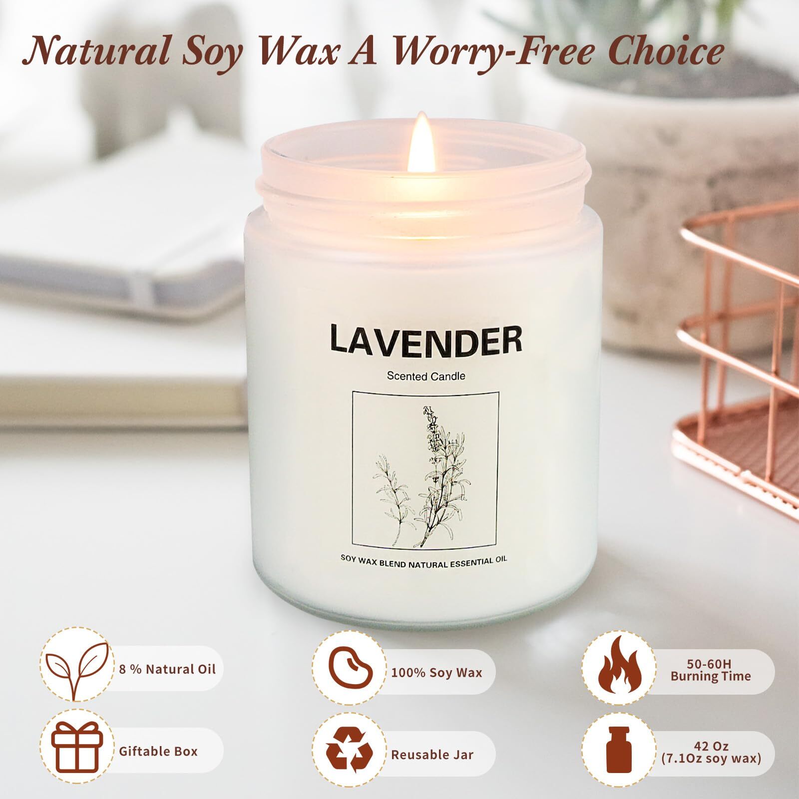 Candles for home scented: Each candle weighs 7.1oz, 3.7*2.9 (inches), retains fragrance for 50-60 hours, burns without black smoke, upgraded wick does not break easily, and can burn soy wax completely to the bottom of the jar,can be used for yoga, SPA, relaxing, removing odors, the perfect addition to the bathroom, bedroom, kitchen, living room, office, and more. Pleasant Scents:3Pcs Lavender + cactus blossom + oriental wood+ theo peanut are wonderful familiar aromas that bring a Relaxing and soothing effect,Let Your Stress Go In The House Warming Fragrance Of Our Lavender Candles,Allowing you to relax, improve sleep quality and relieve stress. Natural Soy Wax : Aromatherapy candle sets Made from premium soy wax and 8% premium oils without bad ingredients. oils with wicks made from lead-free cotton to provide a cleaner, longer burn. Light it up to give you relaxation and stress relief. RECYCLABLE CANDLE JARS :The scented candles exterior made of high quality high temperature resistant white clear frosted glass jar, once fully burned, they can be used for planting plants, decorate your home, and a great storage container for some small items. Great gifts for Any Occasions: Elegant packaged, Unique canned candles. The candles can be perfect gifts for women,Graduations, Wedding, Mothers Day, Christmas gift, New Jobs, Valentines Day, house decor gifts, best friend gifts, candle lovers gifts and an even better treat for yourself for all occasions.