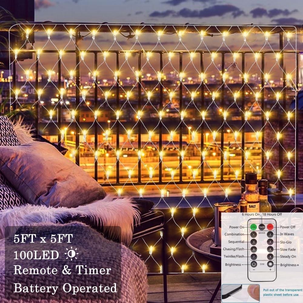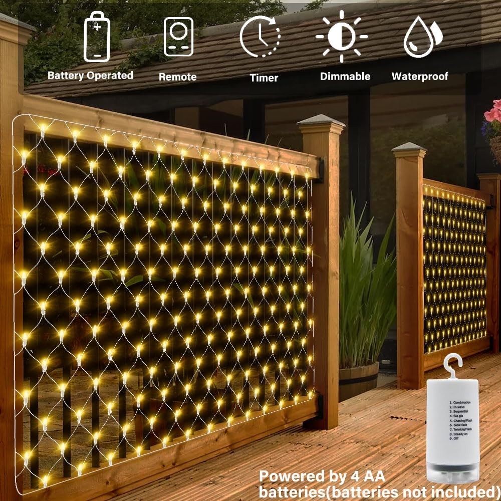 Net Lights Battery Powered for Outdoor,100LED 5FTx5FT Fairy Incandescent String Light,Net String Lights Waterproof with 8 Modes Remote Control Christmas Net Lights for Tree Bush Yard Fence Decor ✨UNIQUE APPEARANCE NET STRING LIGHT: Net lights are designed for bushes Elevate your outdoor decor with 5ftx5ft net + 150LED. Featuring a unique diamond design to improve brightness, durableness, and visual aesthetics. These net lights offer endless possibilities to suit your mood and style. ✨8 LIGHT MODES:Simply use the remote control for operation. 8 adjustable modes (combination, in waves, sequential, slogs, flash, slow fade, twinkle, and steady on). You can adjust the 4 dimmer level and 6h/8h/6639h timer as needed. ✨IP44 WATERPROOF AND DURABLE:Our net string lights are built to withstand rain or water spill with their waterproof design. Whether it's raining or snowing, these lights will continue to shine bright, adding a touch of magic and beauty to your outdoor space. ✨BATTERY-OPERATED TREE NET LIGHTS: Requires 4 AA Batteries (Not Included). Simply insert the batteries and let the magic happen. Safe and energy-efficient with battery power, the lights can be placed anywhere without the need for an electrical outlet. ✨BEST PRESENT:Outdoor net bushes lights suitable for yard, patio, balcony, wall, roof, window decoration, perfect for wedding, bushes,birthday party and Easter, Super Market, Tree and more.