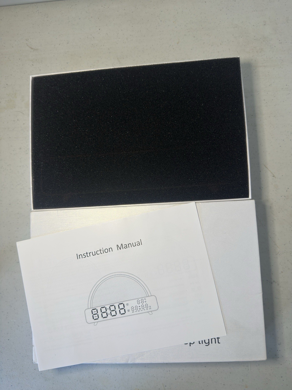 Brand new and unused sunrise alarm clock with sleep and wake-up light function. Still in original packaging with all accessories and instruction manual. Features: • Simulates natural sunrise to help you wake up gently • Large LED digital display (time, temperature, day of the week) • Adjustable brightness and alarm volume • Multiple alarm sounds • USB powered (cable included) • Includes user manual • Color: Gold/Black • Ideal for bedrooms, kids, or heavy sleepers Condition: Item is brand new and has never been used. Opened only to take photos. Box and contents are in excellent condition. Please refer to photos for exact item details. Feel free to message with any questions!