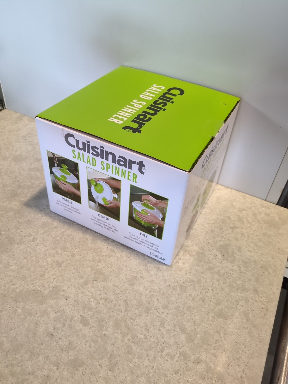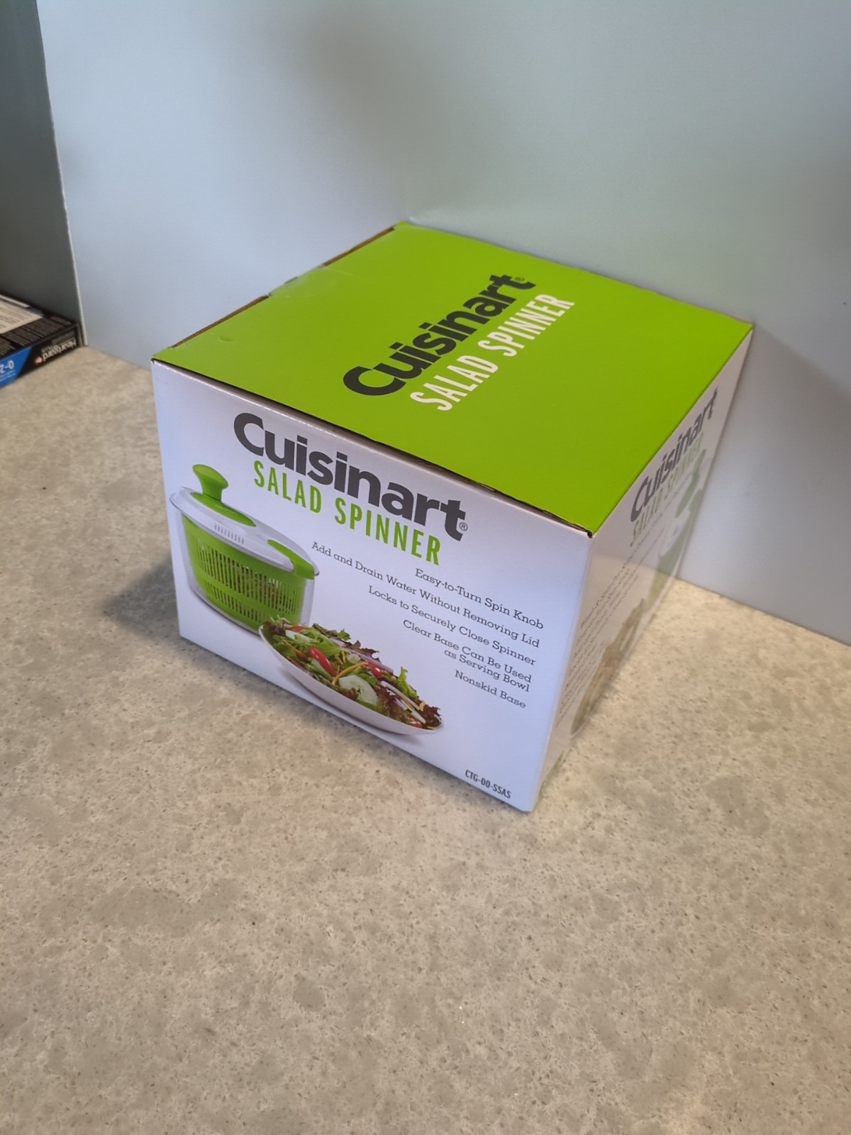 This is a Cuisinart Salad Spinner in green, with a 3-quart capacity. It is medium-sized, made of plastic, and features a nonskid base for stability and easy cleaning. The model number is CTG00SSAS. The set includes the salad spinner. It is designed for preparing salads and is unused in its original box.