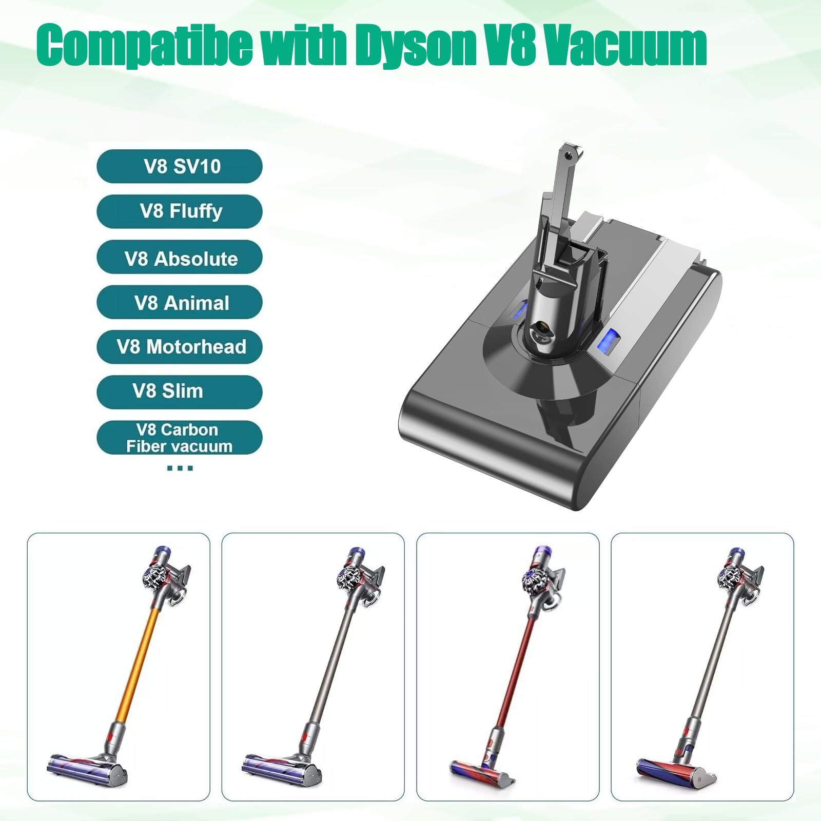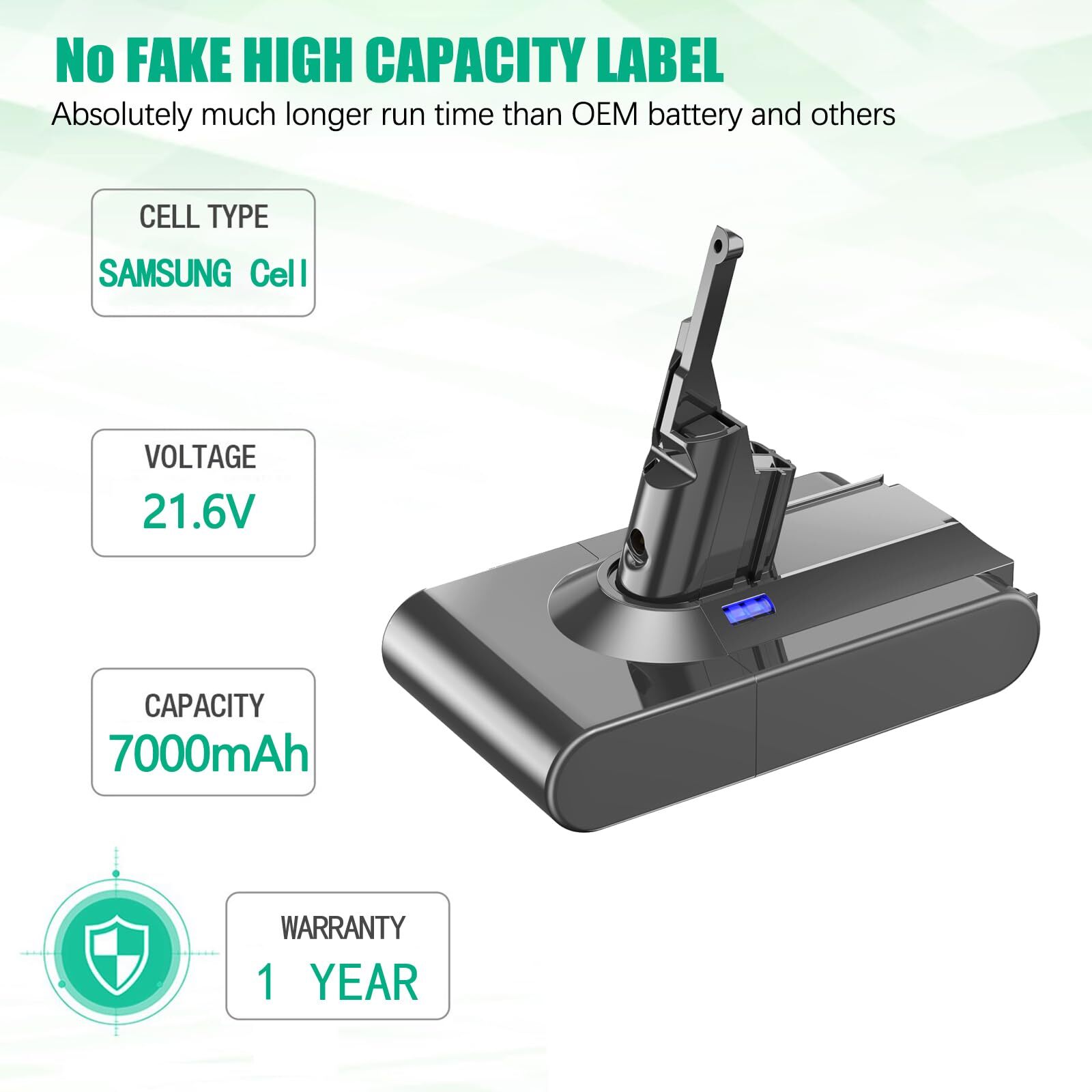 New Upgraded 7000mAh V8 SV10 Battery Compatible for Dyson V8 Vacuum Animal/Absolute/Motorhead/Fluffy Handheld Cordless Vacuum Cleaner Li-ion 215681 SV10 967834 05 Battery 【Upgraded 7.0Ah Capacity】Battery Type: Lithium Ion, Battery Voltage: 21.6V, High Capacity: 7000mAh offer stronger suction and longer lifespan. 🚩 Note: A new battery must be fully charged before use. (at least 5 hours). And it can be fully activated and achieve optimal performance after 2-3 times regular use (full charge/discharge). 【100% Compatible】Fully Compatible with Dyson V8 Animal Cordless Stick Vacuum, V8 Animal Cord Free Vacuum, V8 Animal HEPA Cordless Stick Vacuum, 214730-01 V8 Absolute Cordless Stick Vacuum, V8 Motorhead Cordless Stick Vacuum Pet Hair Vacuum, V8 Motorhead HEPA Cordless Stick Vacuum, V8 Animal+ Cord-Free Stick Vacuum, V8 Fluffy HEPA Cordless Stick Vacuum. 【Safety and Stability】A+ level Li-ion cells and Intelligent chip provide comprehensive protection: overcharges, over-discharge, over-current and overvoltage protection to ensure safety and extend battery life. Acquisition of CE FCC ROHS certificates. 【Easy to Install】Same size and design as original Dyson Battery. It's suitable for OEM charger, easy installation and fits perfectly. Suitable for original charging station and wall charger. 【Buy Worry-free】We provide 30 days full refund and return, 365 days limited warranty, 24 hours warmly service. 🚩Contact us: Any question click the "Ask a question" on our storefront or in "YOUR ORDER" options click the "contact seller" Specification: Voltage: 21.6V Capacity: Upgraded 7000mAh. Battery Type: Rechargeable Li-ion Battery Much longer run time than original battery and others, 100% compatible with original charger and docking station. Compatible with Dyson V8 Vacuum Models: for Dyson V8 Fluffy Vacuum for Dyson V8 Absolute and Dyson 214730-01 V8 Absolute Cord-Free Vacuum for Dyson V8 Absolute Cordless Stick Vacuum Cleaner for Dyson V8 Absolute Stick Vacuum Pet Hair Vacuum Cleaner for Dyson V8 Motorhead, V8 Motorhead Origin for Dyson V8 Carbon Fiber vacuum for Dyson V8 Animal, V8 Animal Pro and Dyson V8 Animal Cord-Free Vacuum for Dyson V8 Animal Cordless HEPA Vacuum Cleaner for Dyson V8 Animal Exclusive vacuum and Dyson V8 Animal Cord Free Vacuum for Dyson V8 Animal Cordless Stick Vacuum Cleaner Shipping We offer FREE shipping on all orders! We ship within Three business days of payment, usually sooner. We use a selection of shipping services such as UPS, FedEx, USPS etc. We only ship to the lower 48 states, no APO/FPO addresses or PO Boxes allowed. Local pickups and combined shipping options are not provided at this time. Return You can return a product for up to 30 days from the date you purchased it. Any product you return must be in the same condition you received it and in the original packaging. Please keep the receipt. Feedback Customer satisfaction is very important to us. If you have any problem with your order, please contact us and we will do our best to make you satisfied. Contact Us If you have any queries, please contact us via ebay. We usually respond within 24 hours on weekdays. Please visit our eBay store to check out other items for sale! Thank you for shopping at our store.