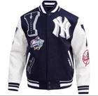 Show off your love for the New York Yankees with this stylish and unique varsity jacket. The jacket features a navy blue and white leather sleeve design with chenille embroidery that adds a touch of elegance to the overall look. It is made of high-quality wool and leather materials that ensure durability and comfort. This jacket is perfect for any baseball fan, especially those who support the New York Yankees. It is officially licensed and features the team's logo, making it a must-have for any fan. Whether you're going to a game or just want to show off your team spirit, this jacket is the perfect choice. NOTE ; Cuatom made jacket also available, send us your logo for custom jacket. Thanks