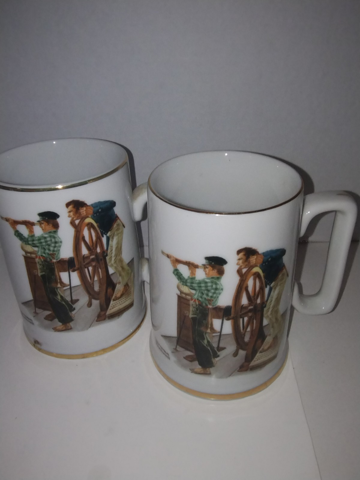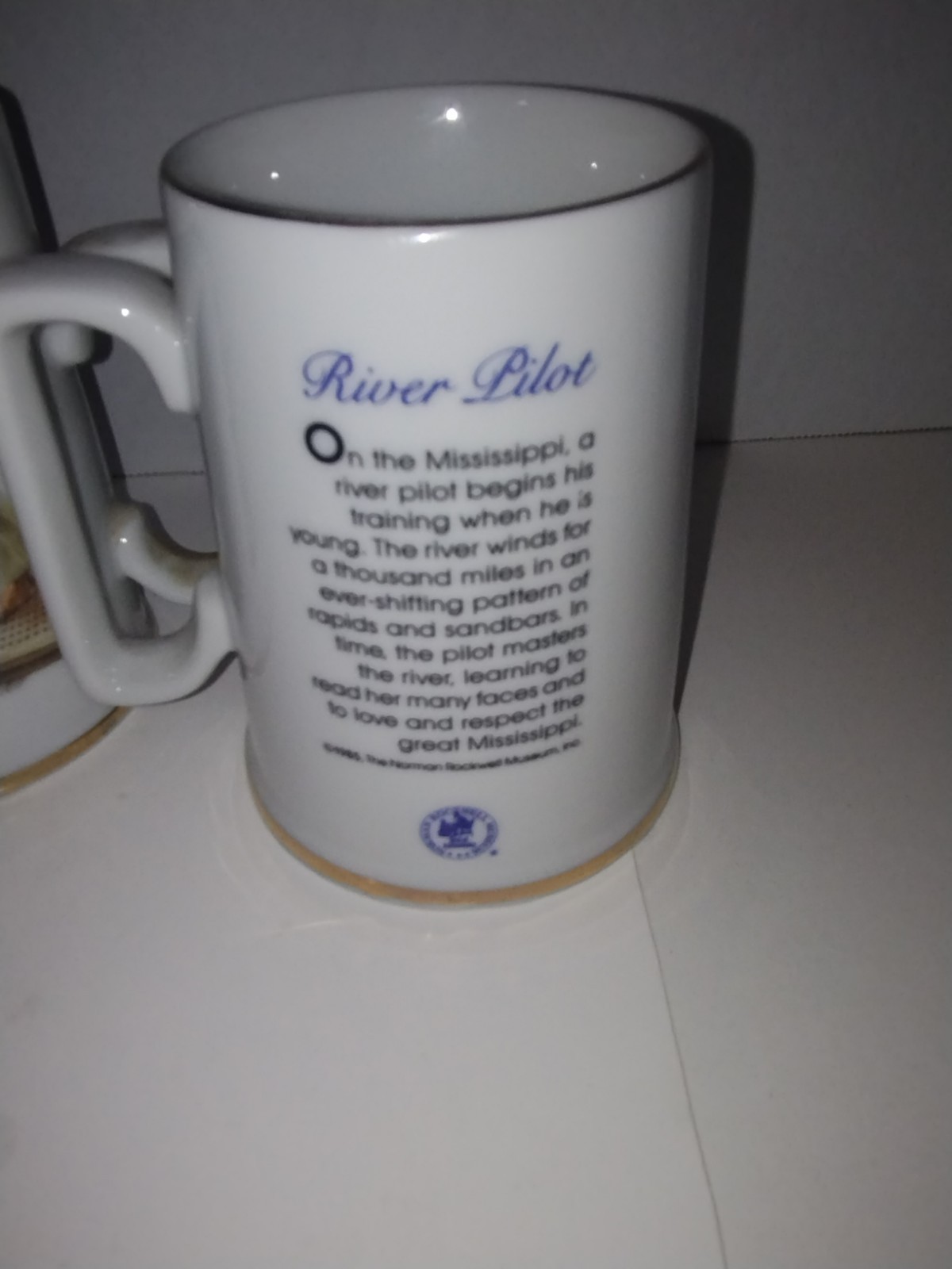 The Normal Rockwell Museum 1985 River Pilot Mug Set of 2 is a vintage/retro styled collectible item from the Normal Rockwell Museum. These mugs are designed to complement the River Pilot model and are compatible with other products in the Normal Rockwell Museum brand. Perfect for home and garden enthusiasts, this assembled mug set adds a touch of nostalgia and character to any living space.