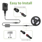 Package Included ● 1 X 16 Meters RGB Light Strips ● 1 X RF Remote Controller ● 1 X LED Receiver ● 18 X Mounting Bracket ● 1 X Power Adapter No Contains Strip Light Connectors Specifications ● Colour: RGB ● LEDs Type: 5050 LEDs ● Strip Light Dimension: 16M (480LEDs) ● Working Voltage: 24V DC ● Adapter Wattage: 24W ● Adapter Input Voltage: 100-240V AC ● Waterproof: Yes ● Lifespan: 50,000 hrs ● Certification: UL/FCC Certificate NOTE ● For the stability of the led strip lights, please fasten the strip lights with Mounting Bracket (package include) after stick the strips to the wall. ● Please take the light from the reel before testing the product. ● Although we provide repair glue for cutting, we still do not recommend cutting it. Wide Usage It can be used in buildings, walkways, gardens, fences, porches, restaurants, clubs, bars, etc., with a variety of colors and waterproofing to meet the requirements of many scenarios. 【Safety & Energy Saving】 Use 24V low voltage as working voltage, protect the safety of children and adults, with ETL safety certification. Using high quality LED beads, the lighting effect can be comparable to high voltage strip lights, saving energy. 【App & RF Remote】 The rope light has a variety of mode functions, which can be freely selected through APP control. RF remote control is simple to use, a wide range of control, can meet the basic setting of the lamp. 【Waterproof】 All parts, including power supply, are waterproof. The outside strip IP65 waterproof protective case, which can effectively protect the chip and extend the service life. Suitable for both indoor and outdoor use. 【Music Sync Lighting】 The built-in sensitive mic allows the light bar to synchronize with your favorite music. It is the perfect decoration for festivals and parties. 【Complete accessories】 Provide a complete set of accessories for installation, such as buckles, cable ties, glue, etc. Note: Glue should be used to repair after cutting, otherwise it will damage the waterproof property. Don't cut it unless you have to.