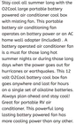 Stay cool all summer long with the O2Cool large portable battery powered air conditioner cool box with misting fan. This portable battery air conditioning fan operates on battery power or an AC home wall adapter (included) . A battery operated air conditioner fan is a must for those long hot summer nights or during those long days when the power goes out for hurricanes or earthquakes. This 12 volt O2Cool battery cool box fan goes anywhere and last for hours on a single set of alkaline batteries. Always plan ahead and stay cool! Great for portable RV air conditioner. This powerful long lasting battery powered fan has more cooling power than any other.
