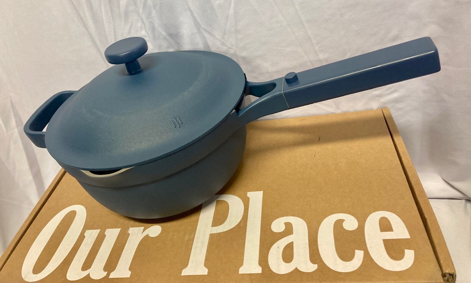 Tracking Number is provided for all listings! -- All items will be shipped out within 0-1 days after purchase! Feel free to ask us any questions you may have for our listings! -- OUR PLACE~Mini Perfect Pot, 2.5QT, Blue Salt, NEW (open bx) What's Included.. Mini Perfect Pot 2.0 Self-basting, steam-release lid with a built-in strainer Nesting Beechwood Spoon 16.9 in. length, 8.5 in. diameter, 4.2 in. depth, 6.7 in. height with lid 2.5 qt. capacity Lightweight construction (3.3 lb.) Compatible with all cooktops, including induction Aluminum body for fast, even heat Designed as a pot that does everything and then some, this ultra-handy size is perfect for sauces, soups, grains, eggs, leftovers, and so much more. A 2.5 qt. pot that boils, bakes, braises, roasts, fries, strains, serves, stores … does it all! Featuring Thermakind® — our exclusive, most advanced, 50% longer lasting ceramic nonstick coating made without potentially toxic materials like PFAS (including PTFEs and PFOAs), lead and cadmium Oven safe up to 450°F, for all your favorite stovetop-to-oven recipes