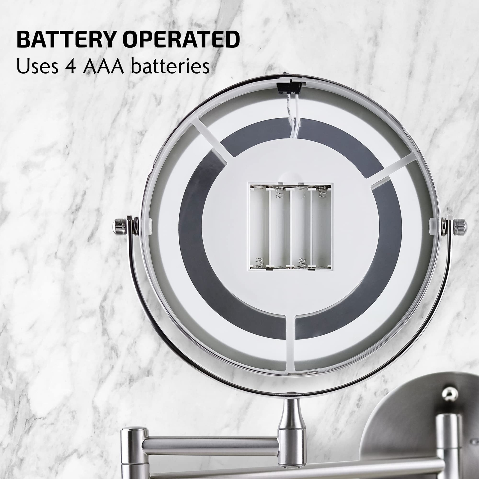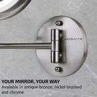 OVENTE 7" Lighted Wall Mount Makeup Mirror - 1X/ 10X Magnification, Battery Powered Glow Cosmetic Light up, Spinning 360-Degree, Double Sided LED, Extendable, Folding Arm, Nickel Brushed MFW70BR1X10X Product Details Color: Nickel Brushed Size: 7" Style: 10X Magnification Brand: OVENTE MPN: MFW70BR1X10X UPC: 814667020482 EAN: 0814667020482 Brand: OVENTE Room Type: Bathroom Shape: Round Product Dimensions: 8.1"L x 1.4"W Frame Material: Iron Brand: OVENTE Room Type: Bathroom Shape: Round Product Dimensions: 8.1"L x 1.4"W Frame Material: Iron Style: 10X Magnification Mounting Type: Wall Mount Finish Type: Brushed Surface Recommendation: Wall Special Feature: Dual Sided, Fog Free, Lighted, Wall Mountable, Magnifying Color: Nickel Brushed Theme: Space Specific Uses For Product: Personal Care Number of Pieces: 1 Number of Items: 1 Material: Glass, Iron Frame Type: Framed Item Weight: 1.93 Pounds Assembly Required: Yes Frame Color: Antique Bronze Magnification Maximum: 10 Inches Manufacturer: OVENTE UPC: 814667020482 Global Trade Identification Number: 82 Item Weight: 1.93 pounds Country of Origin: China Item model number: MFW70BR1X10X Batteries: 4 AAA batteries required. Is Discontinued By Manufacturer: No Finish types: Brushed Warranty Description: 1-year warranty on domestic (usa) repairs and replacements on workmanship and materials from date of purchase from authorized reseller. International inquiries please contact manufacturer customer service directly for better assistance. Batteries required: Yes Import: Imported 5.2'' VIEWING SPACE, DUAL-SIDED & 10X MAGNIFYING - Experience unparalleled precision and clarity with our innovative makeup mirror. Featuring a generous 5.2'' viewing space, this mirror ensures you never miss a detail during your makeup application or grooming routine. Its dual-sided design offers versatility, providing both standard and 10x magnification options to suit your needs. Whether you're perfecting your eyeliner or tweezing your eyebrows, this mirror offers amplified clarity for flawless results every time. Say goodbye to guesswork and hello to precision with our dual-sided mirror with 10x magnification, your ultimate beauty companion. 13'' EXTENDING ARM with NATURAL WHITE DIFFUSED LED RING LIGHT - Face an unmatched convenience with an impressive 13'' extension from the wall, this mirror offers maximum flexibility and ease of use, allowing you to find the perfect angle effortlessly. Enhanced by a natural white diffused LED ring light, our mirror provides optimal illumination for flawless makeup routines. Our advanced diffused light technology ensures a soft, natural glow that replicates daylight, allowing you to see every detail with absolute clarity. Elevate your beauty routine and achieve flawless results with our premium mirror solution. DISTORTION-FREE MIRROR & 360 ROTATION MECHANISM - This cutting-edge wall-mounted mirror, which features a 360-degree rotating mechanism and a mirror surface devoid of distortion. With the distortion-free, premium mirror, experience unmatched clarity and accuracy for precise reflection. The clever rotating mechanism makes it simple to adjust to any angle. Enhance your beauty pleasure with our high-quality mirror, which smoothly blends flexibility with clarity. 4 AAA BATTERY POWERED - Our portable and convenient wall-mounted mirror, powered by 4 AAA batteries for effortless operation. With this feature, you can enjoy the flexibility to place the mirror anywhere without the need for electrical outlets. US-BASED CUSTOMER SERVICE LET'S YOU BUY WITH CONFIDENCE. OVENTE warranties that the product shall be free from defects in material and workmanship under normal use and conditions, for 1 year from the original purchase date. Introducing the revolutionary MFW Series Mirrors—a game-changer for your grooming rituals! More than just a practical accessory, this lighted wall mount makeup mirror serves as a stunning focal point that effortlessly complements various decor themes, from vintage charm to Hollywood glamour. Elevate the atmosphere of your bathroom, bedroom, or vanity space with its elegant LED lighting, infusing a touch of sophistication wherever it's placed. Engineered for convenience, its swinging extension arm allows for easy adjustment, ensuring optimal visibility for all your grooming needs. With its hands-free design, multitasking becomes effortless whether you're at home, in a hotel, at the dentist's office, or even in the shower area. Bid farewell to cluttered countertops—this wall-mounted gem offers a sleek solution, keeping your space tidy and organized. Powered by batteries (not included), installation is a breeze, eliminating the hassle of complicated wiring. Experience unparalleled clarity with the magnified LED vanity mirror, enabling you to attend to every detail of your beauty routine with precision. Whether it's sculpting eyebrows or refining facial hair, this mirror guarantees impeccable results every time. Emitting positive vibes, it enhances the ambiance of any room, catering to individuals of all ages, from kids to adults. Its ability to magnify and showcase your accessories adds an extra layer of luxury to your grooming experience. Take your pick from three deluxe finishes—Antique Bronze, Nickel Brushed, and Polished Chrome—in two size options—6.8 inches and 8.6 inches—and two magnification levels—1x7x and 1x10x. Transform your grooming haven with Ovente’s MFW Series Wall Mount Cosmetic Makeup Mirror—a perfect blend of style and functionality that elevates your space to new heights!